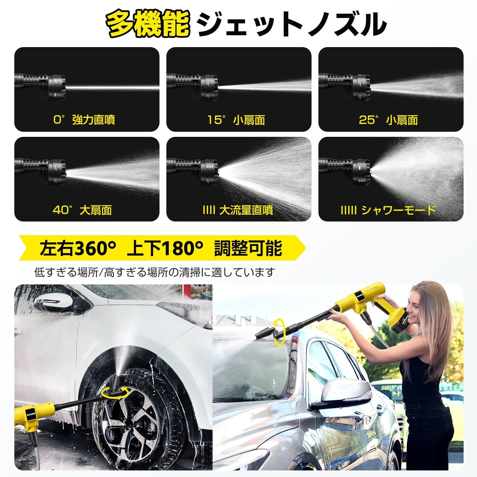 【2025新登場強化版】高圧洗浄機 コードレス 充電式 バッテリー式 洗車機 20000mAh マキタ互換バッテリー 残量表示 洗車店監修 750W 軽量 小型 自吸式 噴射距離10M 洗車 家庭用 2段階 6in1ノズル 水道接続不要 収納ケー付き 持ち運び便利 庭/屋外/階段/ガラス/ブロック塀/玄関/ベランダ/浴室/年末大掃除/キャンプ 日本語取扱説明書 イェロー