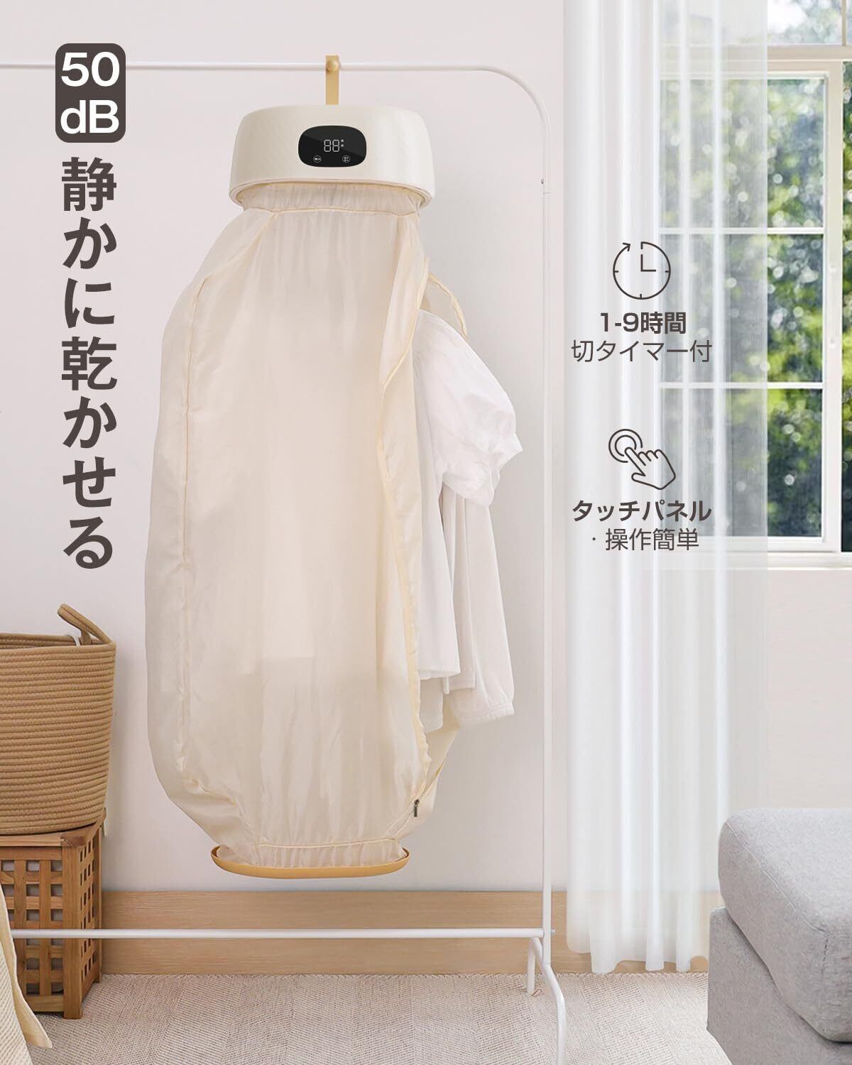 【ネジ止めカモイフック付き . 静音設計 . 切タイマー付】乾燥機 衣類は静音設計を採用し、動作音をわずか50㏈に抑え、快適さと安心のために設計されています。 仕事や勉強、夜間の使用時にも気にならない静音設計です。衣類 乾燥機 には1〜9時間のタイマー機能も搭載されており、洗濯物によって乾燥時間を設定可能、さまざまな洗濯物に対応できます。また、小型乾燥機はネジ止めカモイフックを付き、リビング/寝室/玄関/ベンチ/寮/自宅などハンガーがない場所でも使えます。スタイリッシュで使いやすい小型衣類乾燥機です!