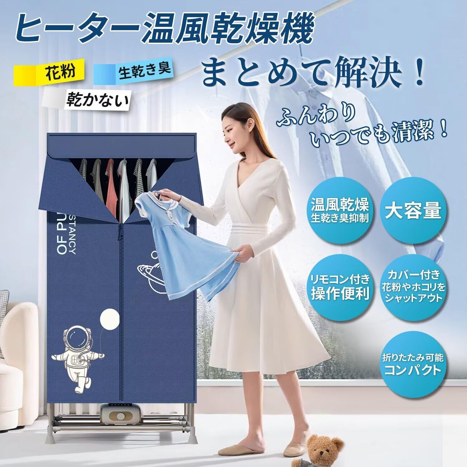 【多機能な乾燥機】冬や雨の日には衣類を乾かすことはもちろん、梅雨時には布団も快適に乾燥できます。寝る前に使用すると、柔らかくてふんわりした蒲団を温め、心地よい睡眠を提供します。さらに、様々な種類の靴も乾燥可能で、ペットの毛並みも手軽に乾かせます。生乾き対策、花粉やホコリの付着予防に最適な折りたたみ室内乾燥機。カバー内の温度を高めることで除菌効果を向上。清潔に仕上げます。生乾き時の菌の増殖による嫌なニオイ防止、部屋干し後の仕上げ乾燥にもおすすめ。機能は細菌や異臭を効果的に除去し、衣類に包括的なケアを提供します。