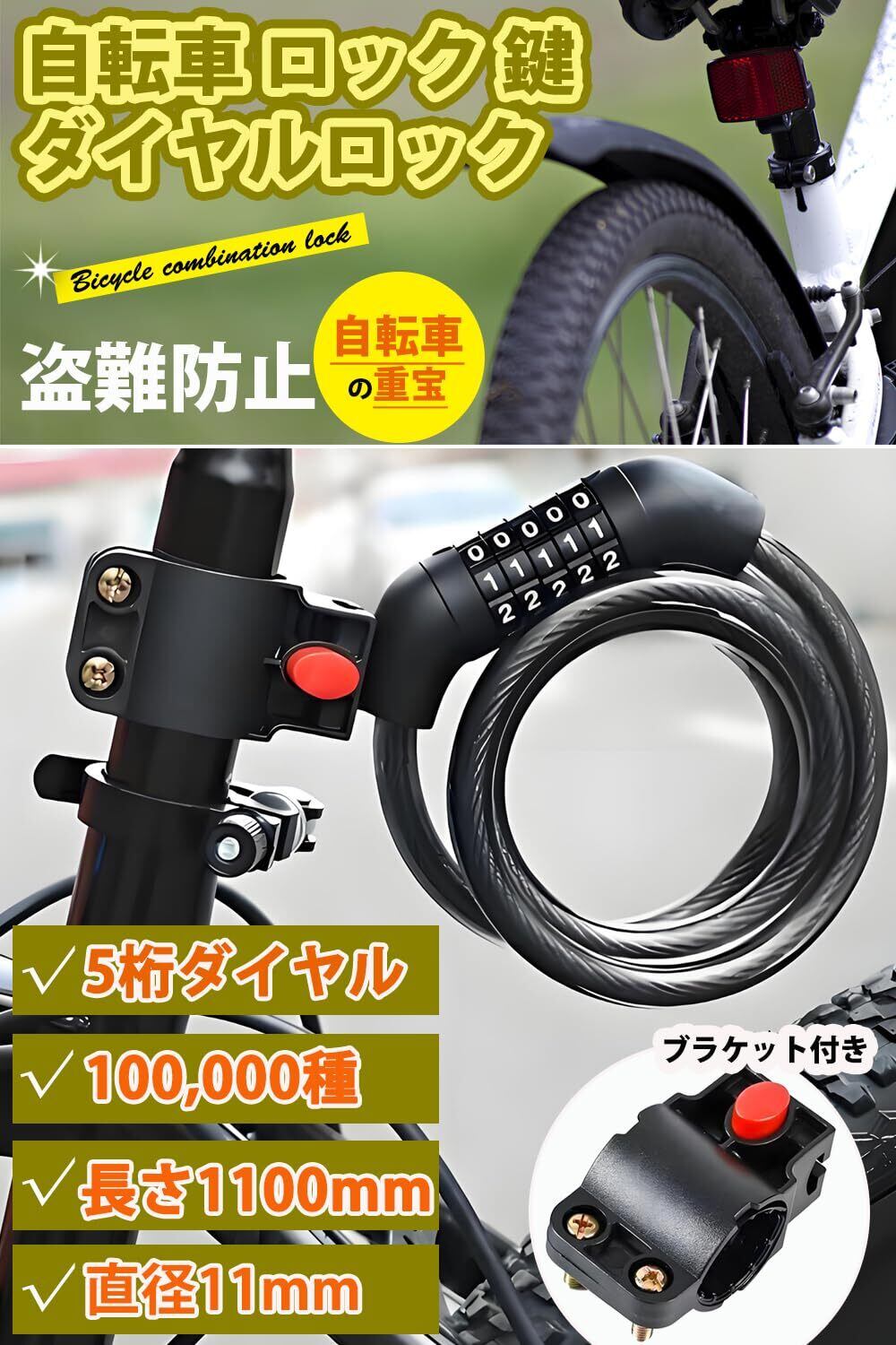 【自転車固定式ロック製品仕様】5桁ダイヤル式のワイヤーロック。長さ:110cm±3cm ワイヤー直径:Φ11mm。重量:約240g。日本語取扱説明書、取り付け用ブラケット付属。