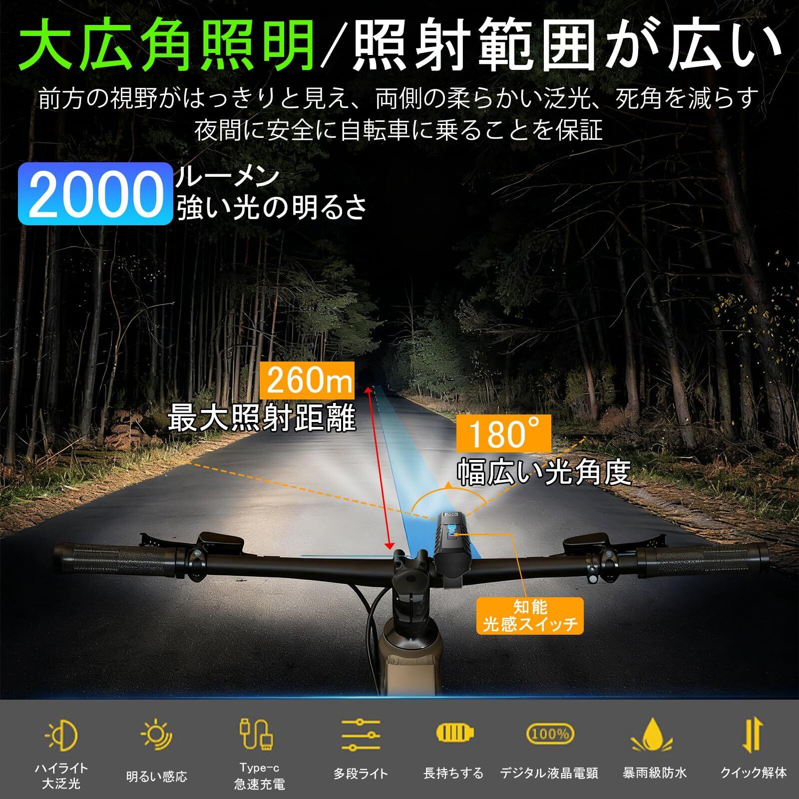自転車 ライト 最強 【超高輝度 2000ルーメン】 光センサー 自動点灯 自転車ライト 180°大ワイド照明 5つ点灯モード IPX6防水 自転車ヘッドライト クロスバイク/ロードバイク ライト LED残量表示 TYPE-C USB充電式 取り付け簡単 小型 明るい 子供 通勤 通学 防振 防災 地震/停電/登山/夜釣り 緊急対応 日本語説明書付き