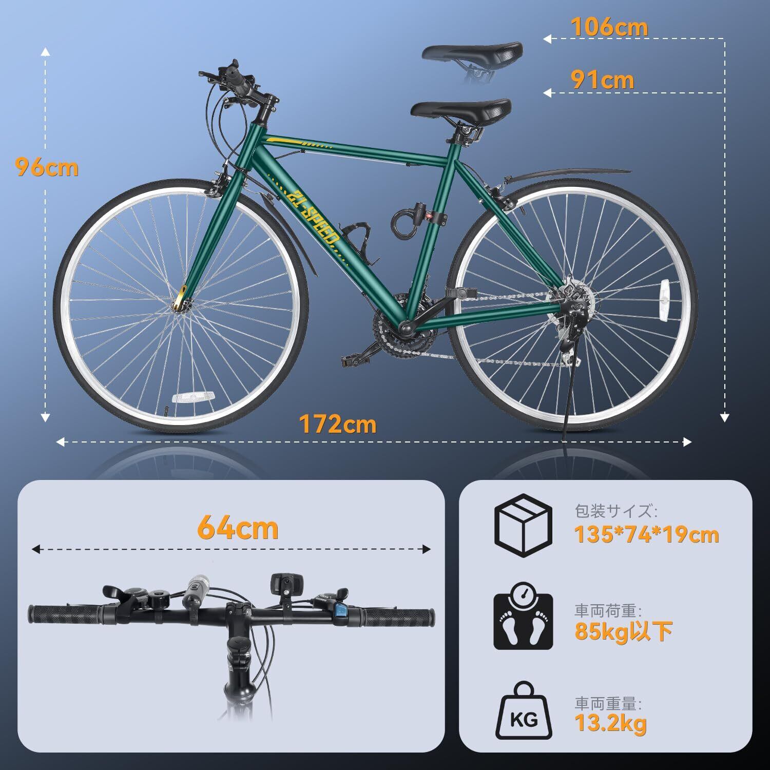 【シマノ変速機・21段変速ギア】本クロスバイクは日本で知名度の高いシマノ変速機を採用し、性能がより効率で、安全性がより高いです。自転車には21段変速ギア(前輪3ギア&後輪7ギア)を装着し、様々な状況に対応でき、最適な走行速度と快適さを確保。複雑な地形にも適用し、スムーズに変速できます。
