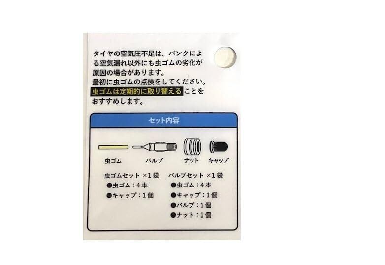 虫ゴム8個、キャップ2個、バルブ1個、ナット1個。