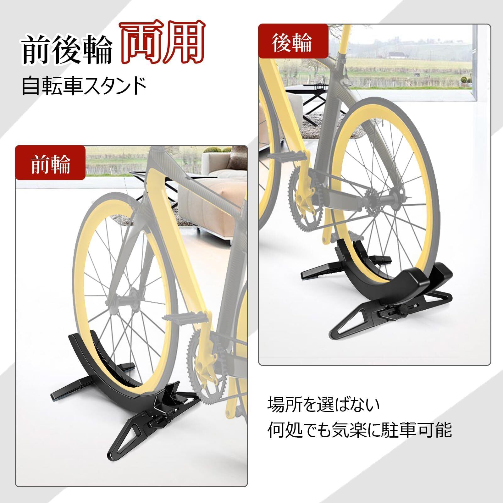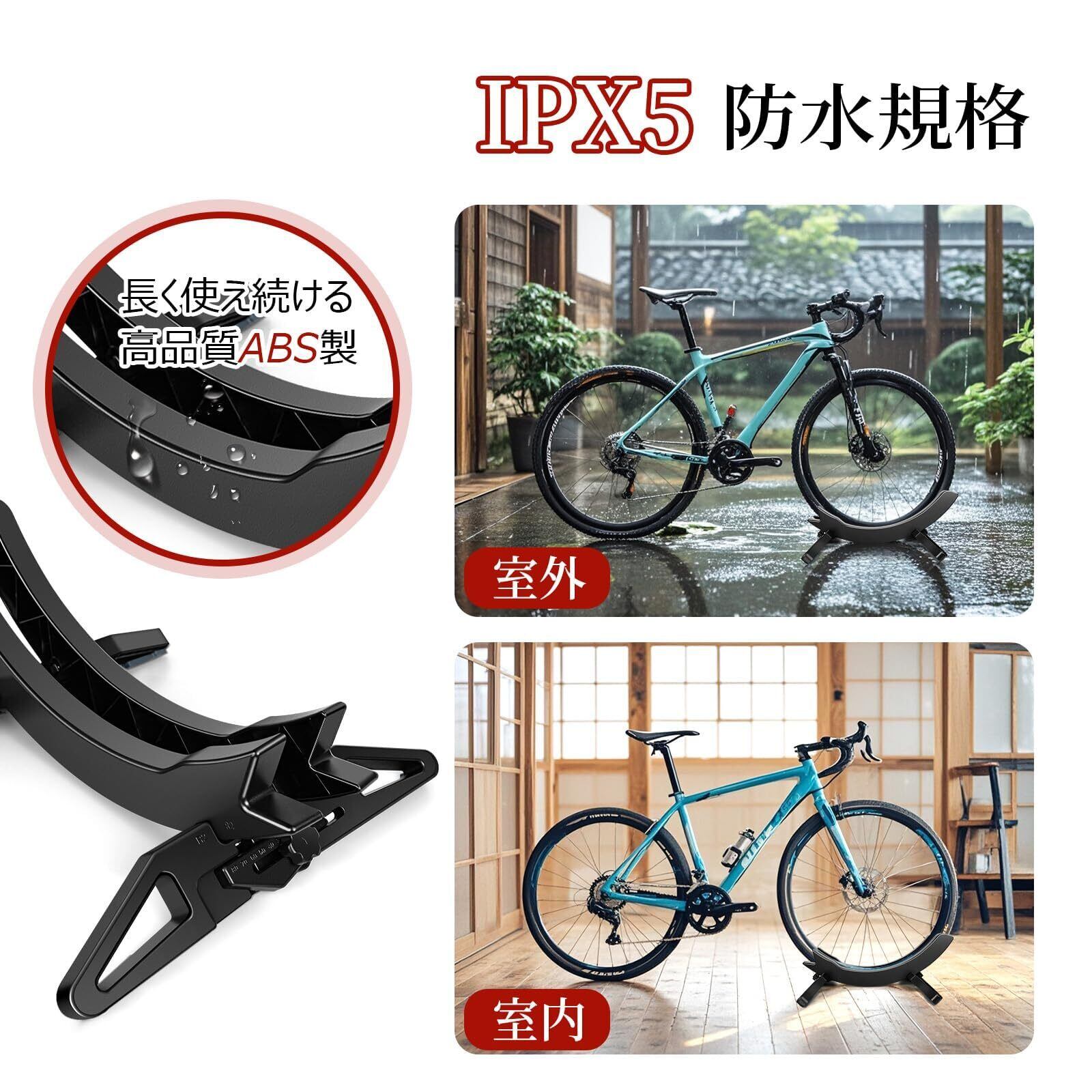 【抜群な安定感】バイクスタンドのフレームと地面が安定した三角構造を形成し、自転車をしっかりと安定させ、優れた転倒防止性能を誇ります。4つの足に滑り止めクッションを搭載し、いつでも自転車を安心駐輪できます。ディスプレイスタンドはABS素材を採用したため、錆びや傷けに強くて、雨の日も対応可能です。