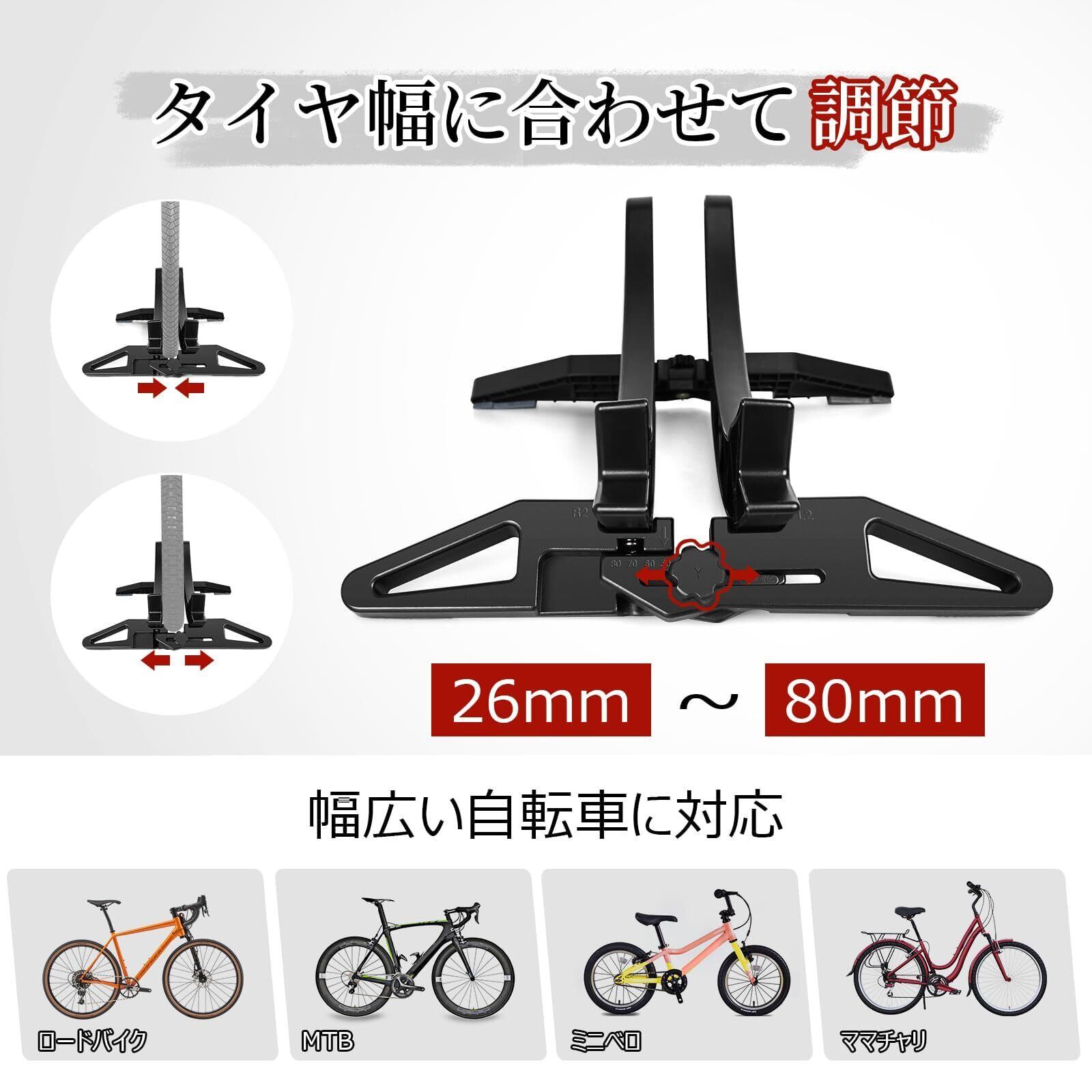 【転倒防止・自転車保護】2026最新型自転車スタンドは左右から車輪をしっかり支えるので、強風や衝撃から自転車を守れ、倒れて故障するリスクを防ぎます。タイヤ幅に合わせて調節可能で、タイヤ幅26mm~80mmの自転車に対応でき、ミニベロ、折りたたみ自転車、子供用自転車、ロードバイク、クロスバイク、マウンテンバイクなど、市販の自転車にほぼ使用可能です。