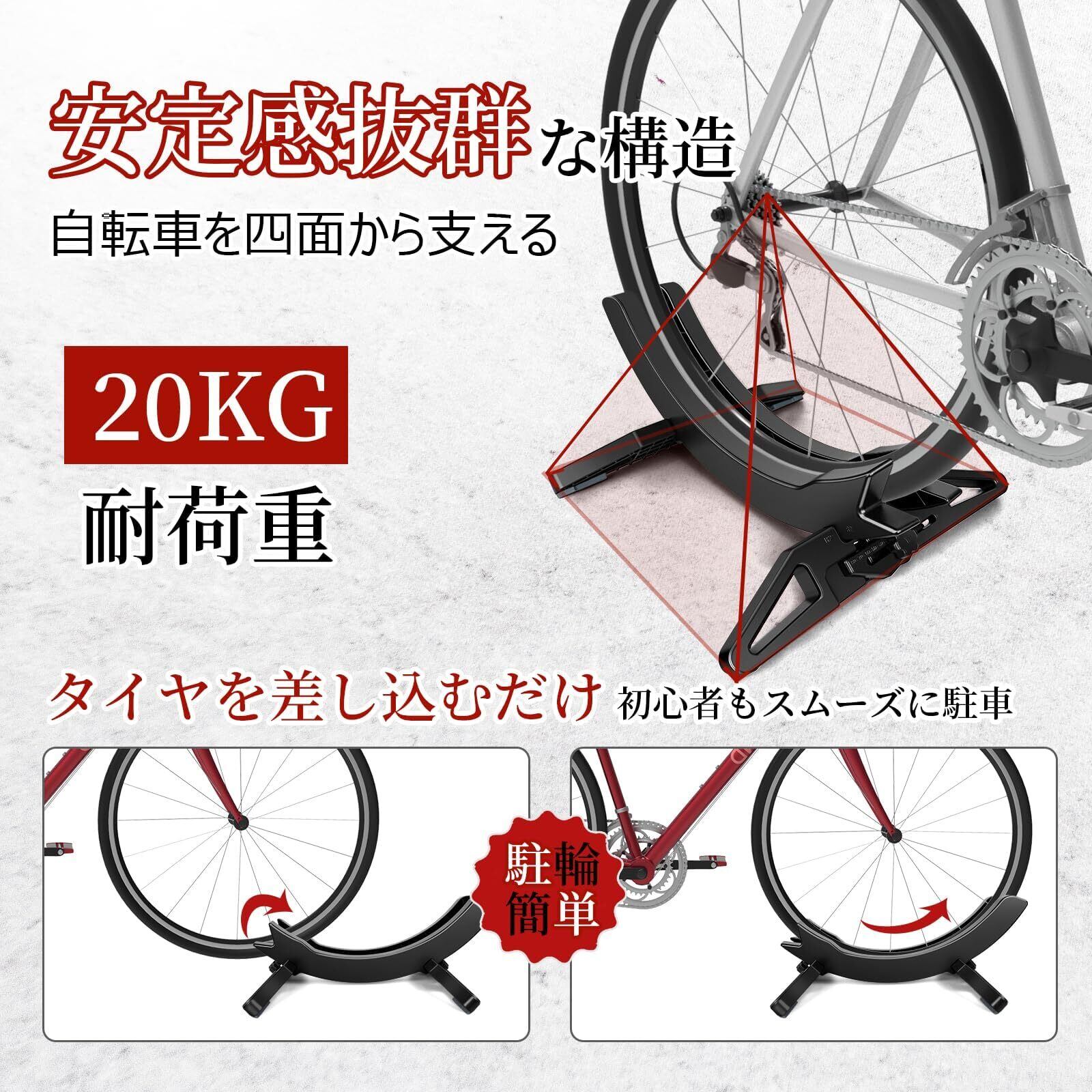 【押し込むだけ簡単駐輪】自転車スタンドの駐輪方法は前輪、又は後輪を駐輪スタンドに差し込んで完成です。自転車を持ち上げる手間もなく、重い電動自転車も気軽に駐輪と使用できます。これより自転車の整理収納も取り出しも手軽くになります。タイヤを包み込むデザインと高品質なABS樹脂を採用。タイヤを圧迫しないため、変形やキズなどのトラブルを根本から防止し、自転車のコアパーツをしっかりと保護します。