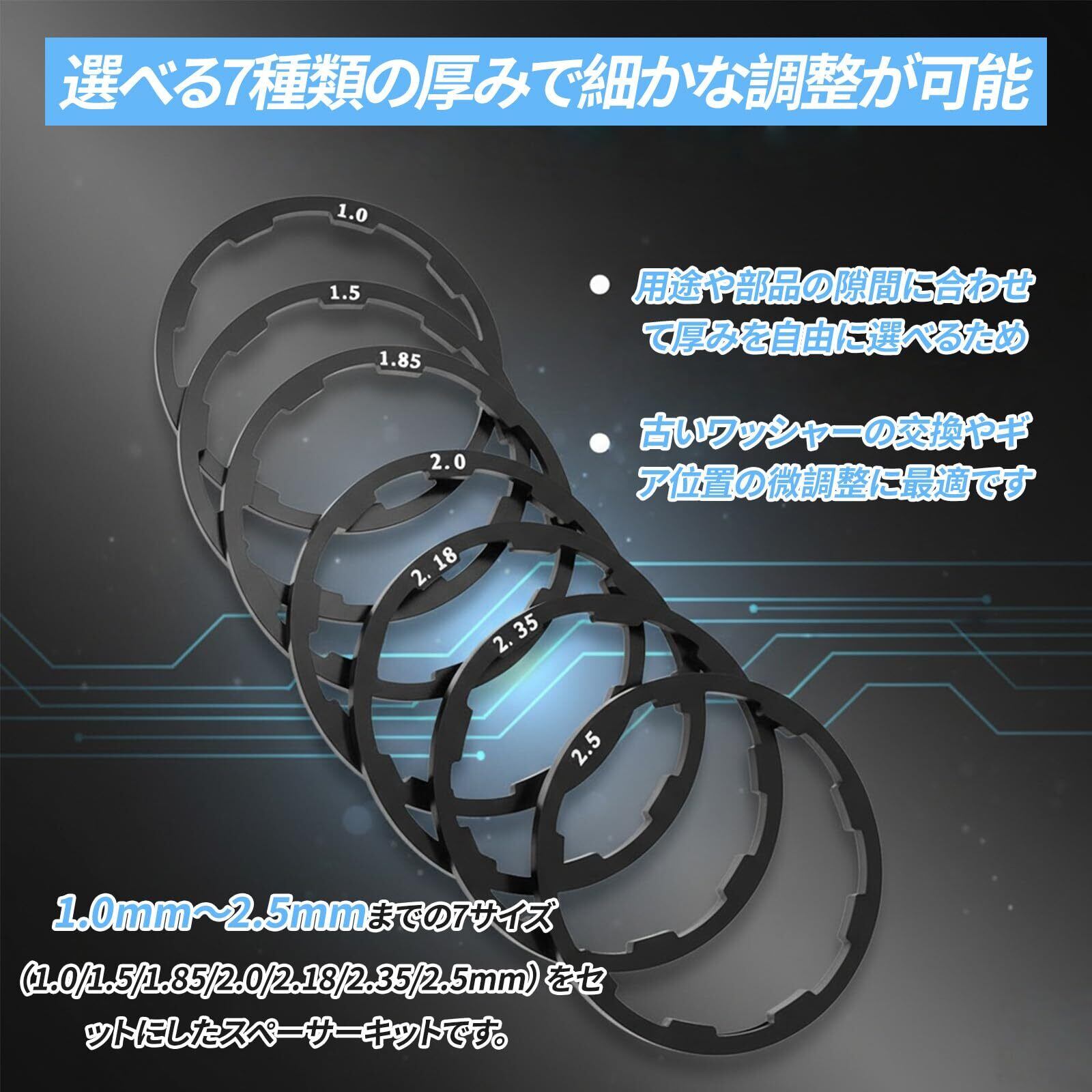 【選べる7種類の厚みで細かな調整が可能】1.0mm〜2.5mmまでの7サイズ(1.0/1.5/1.85/2.0/2.18/2.35/2.5mm)をセットにしたスペーサーキットです。用途や部品の隙間に合わせて厚みを自由に選べるため、古いワッシャーの交換やギア位置の微調整に最適です。 【高品質アルミ合金素材】耐久性に優れたアルミニウム合金を採用し、軽量で錆びにくく、強度も抜群。精密加工により公差が小さく、安定した回転性能を維持します。 【簡単装着】工具を使わず簡単に取り付け・取り外しが可能で、初心者でも扱いやすい設計。短時間でメンテナンスが完了し、作業効率を高めます。 【幅広い互換性】マウンテンバイクやロードバイクなど多様なタイプに対応。フライホイール、ハブ、ボトムブラケットなどの微調整に適しており、自転車の動作をスムーズにします。 【汎用設計】7種の厚みで幅広いギア構成(7速〜11速)に対応。10速ハブから11速、または7速ボックスから8・9・10・11速ハブまで幅広く適合し、自転車メンテナンスに欠かせないアイテムです。