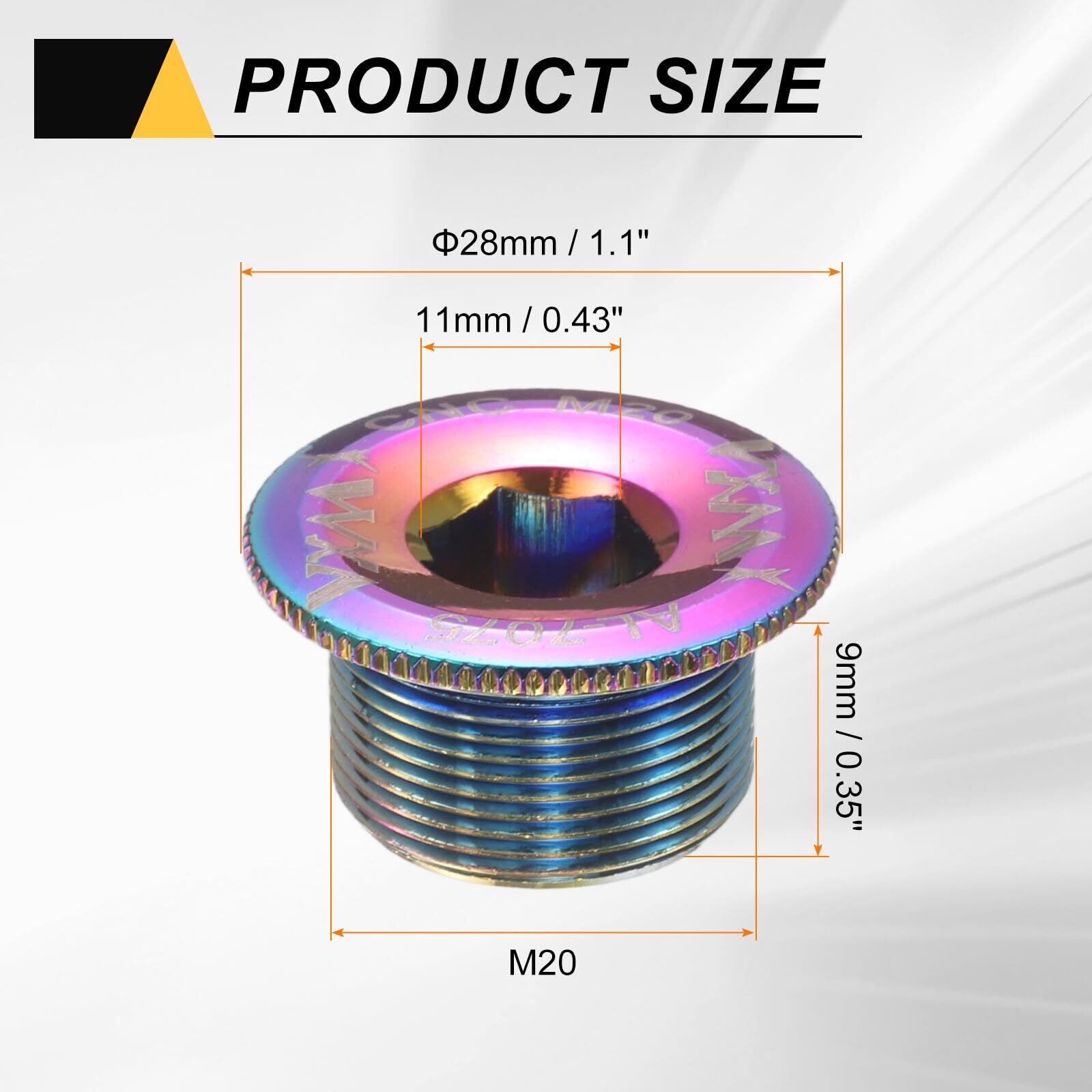 サイズ-ねじ規格:M20;外径:28mm/1.1";全長:15mm/0.59";ねじ長:9mm/0.35";内穴:11mm/0.43"。クランクネジはさまざまなカラーが用意されており、好みやニーズに応じてお好きな色を選べるほか、バイクの外観を更新することもできます。
