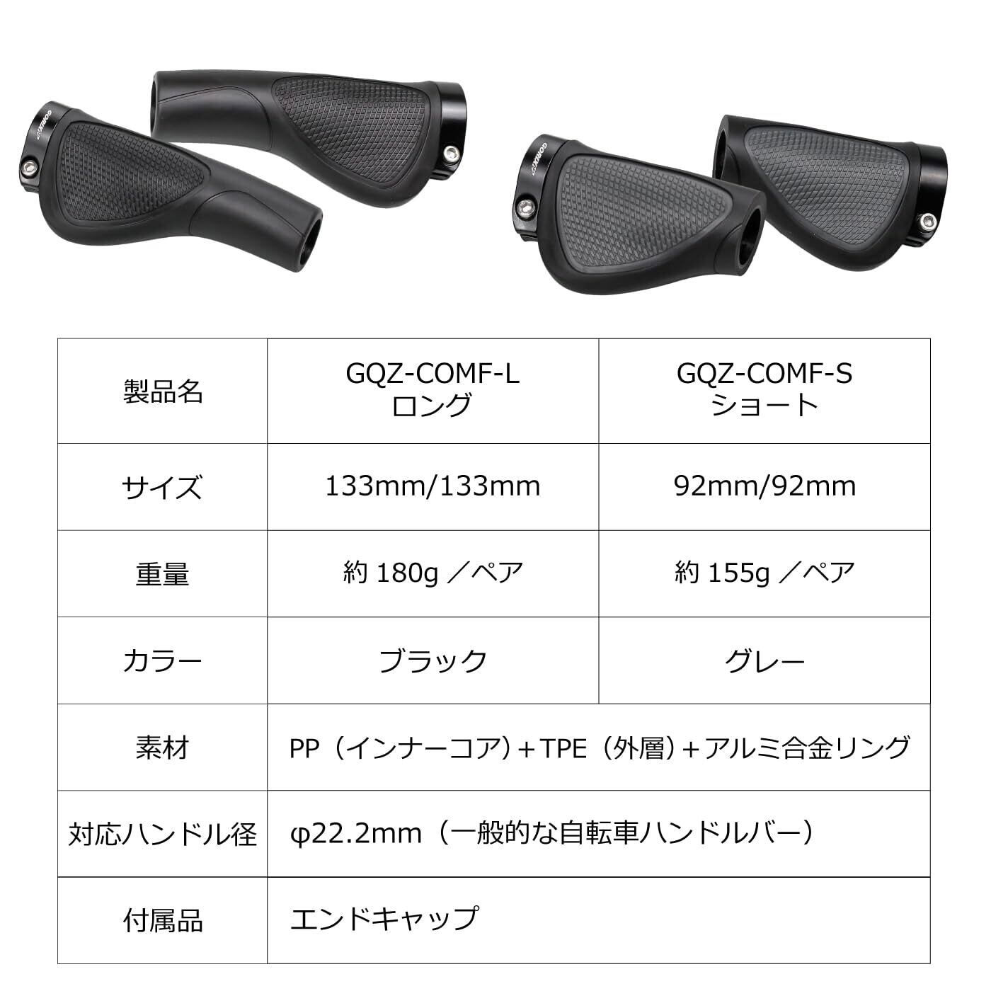 【選べる2サイズ!あなたの自転車と手に最高のフィット感を】 GQZ-COMF-L(133mm・約180g):ロングサイズで、手の大きい方やツーリング・MTB・クロスバイクのハンドルに最適。 GQZ-COMF-S(92mm・約155g):ショートサイズで、変速機(シフター)付きの日常使いの自転車(シティサイクル、ママチャリ)に乗っていて、手の疲労を減らしたい方などに最適。