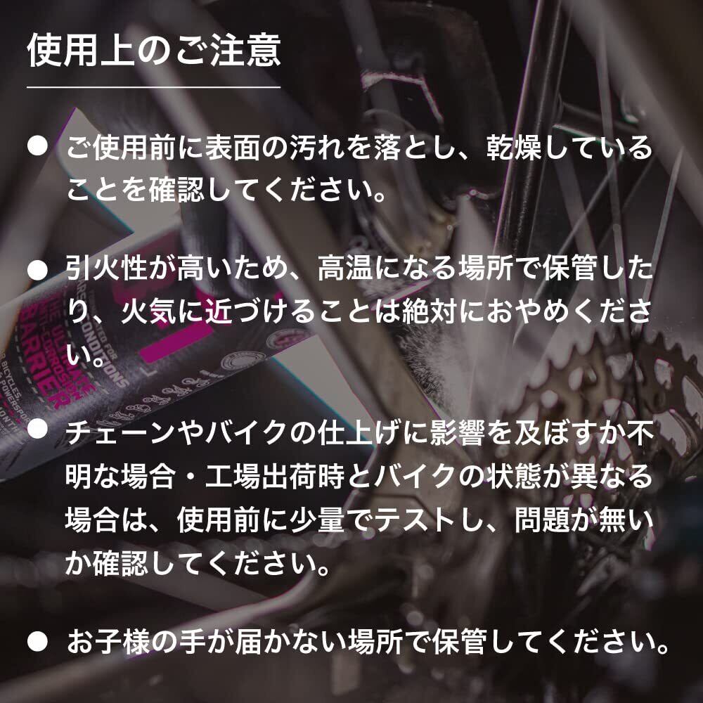 MUC-OFFが自信を持ってお奨めする液体自転車保護スプレー。効果的な水分散作用で、あなたのバイクを保護し、さっぱり綺麗な状態に。クリーナーで洗浄した後の湿気を追い出してバイクの表面に粘着性の無い保護層を形成し、腐食を防止します。汚れの付着を防ぎ、摩擦、摩耗、余計なエネルギー消費をカットする助けとなります。フレーム、ドライブチェーン、金属部品、塗装部分など自転車の様々箇所に使用できます。チェーンに使用した後は、MUC-OFFのチェーンルブを使用するのが理想的です。[ご使用方法]1. バイククリーナーで自転車を洗った後にスプレーし、残留した水分を分散させます。2. 余分な水分を拭き取って乾燥させてください。【ご注意】■ タイヤのトレッド(接触面)やブレーキング面には使用しないでください。【警告】■引火性が高い為、加熱したり火気に近づけることは絶対におやめください。■お子様の手の届かない場所で保管してください。