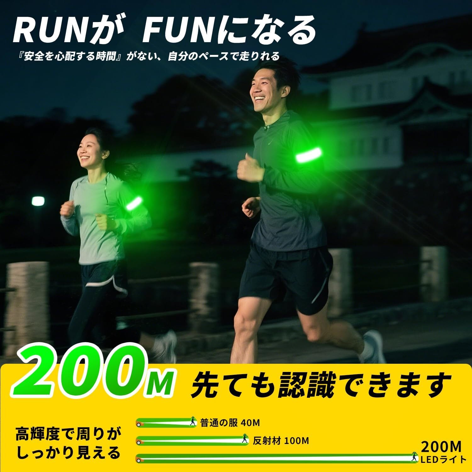ランニングライト 充電式 長持ち 夜間スポーツ用 ジョギング ウォーキング LEDアームバント 安全確保 高輝度 ベルト 夜間の事故防止 回避 反射材 グマジックテープ 伸縮性あり 着用心地いい (グリーン 2本セット)