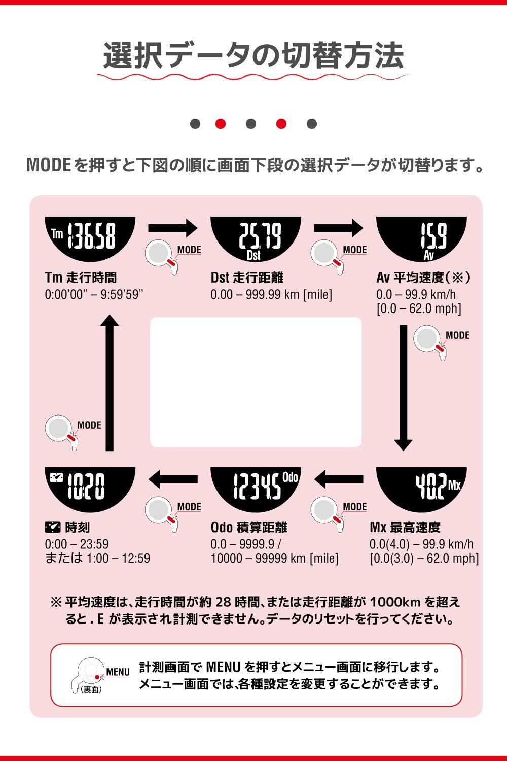 速度(走行速度・平均・最高)、距離(走行距離・積算)、時間(走行時間)、時刻(12・24時間/選択可能)