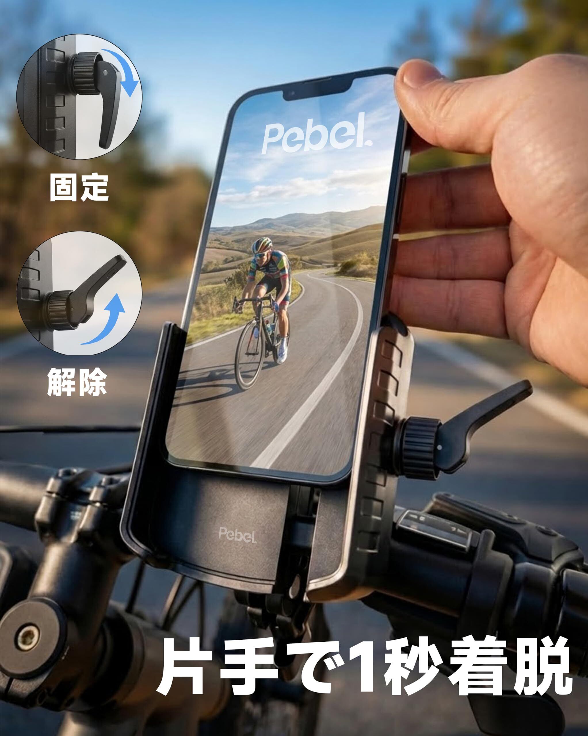 自転車 スマホホルダー 【カメラを遮らない & 1秒ロック】 振動吸収 携帯ホルダー 片手操作 バイク スマホスタンド 360度回転 脱落防止 厚さ15mm対応 ロードバイク 原付 iPhone 17 16 15 14 13 Pro Max Plus/Android 4.7-7.2インチ 日本語説明書付き ブラック