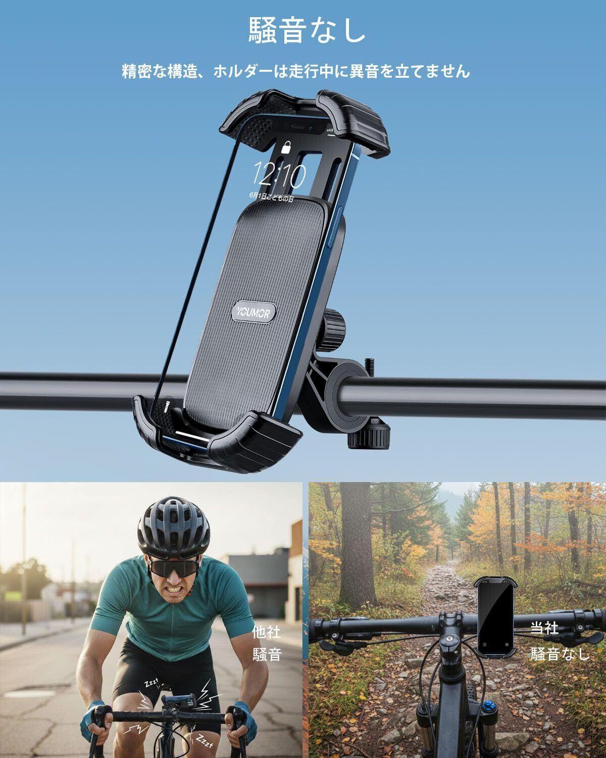 【騒音なし】 自転車 スマホホルダー スタンド YOUMOR 携帯ホルダー ロードバイク スマホホルダー 片手操作 脱落防止 360度回転 振動吸収 スマホ固定 4.7-6.8インチ iPhone/Android対応 日本語説明書付き