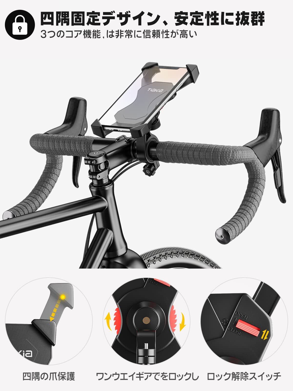 Tiakia 自転車 スマホ ホルダー スタンド スマホ自転車ホルダー ロードバイク 携帯電話ホルダー クロスバイク スマートフォン ホルダー bike phone holder 簡単取付 360度回転 スマホ固定 バイク用 iPhone 15/14/13/12/11/8/7 15pro android 3.5-6.4インチに対応 角度調整 脱着簡単 強力な保護