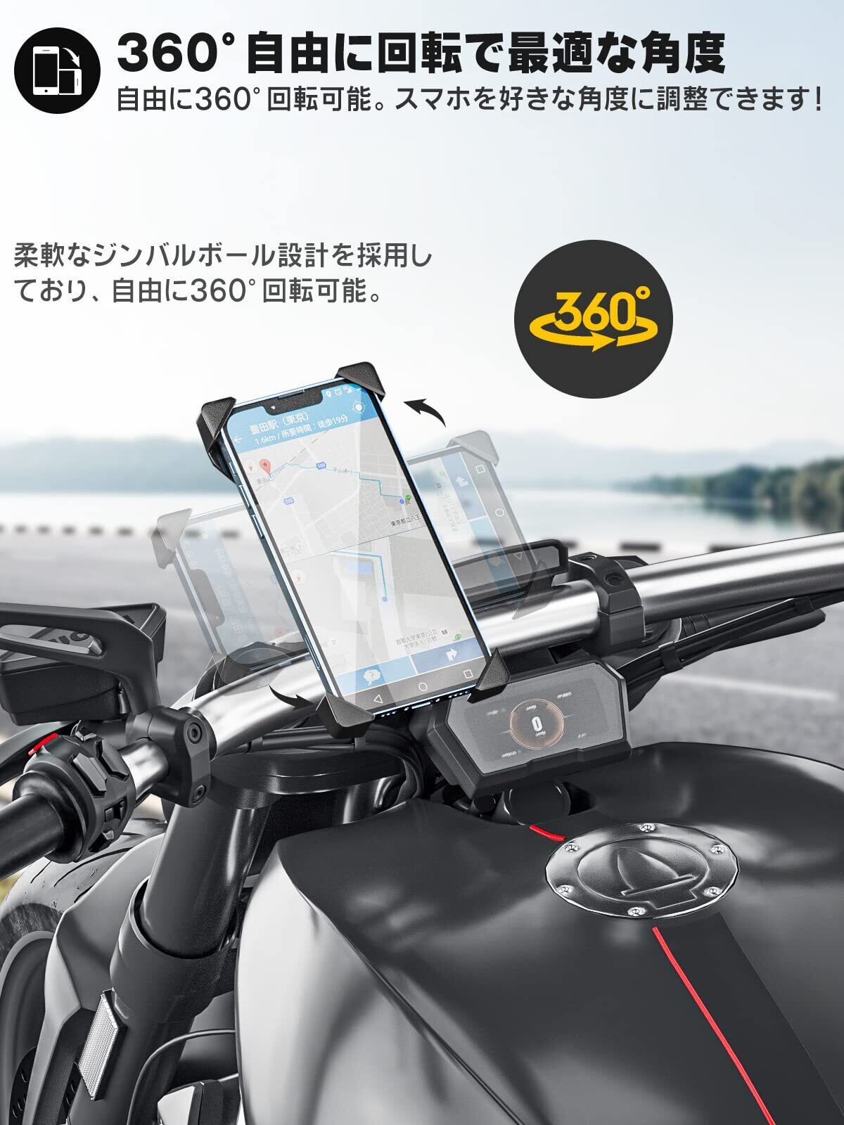 【使用が簡単で便利】四本爪を持つフォックは自由に伸縮調整可能で、様々な携帯サイズを対応できます。携帯ホルダーは平面360度旋回可能、及び小範囲で俯仰角度を調整できます。それによって携帯が最良の角度になり、ライディングに差し支えないようにします。