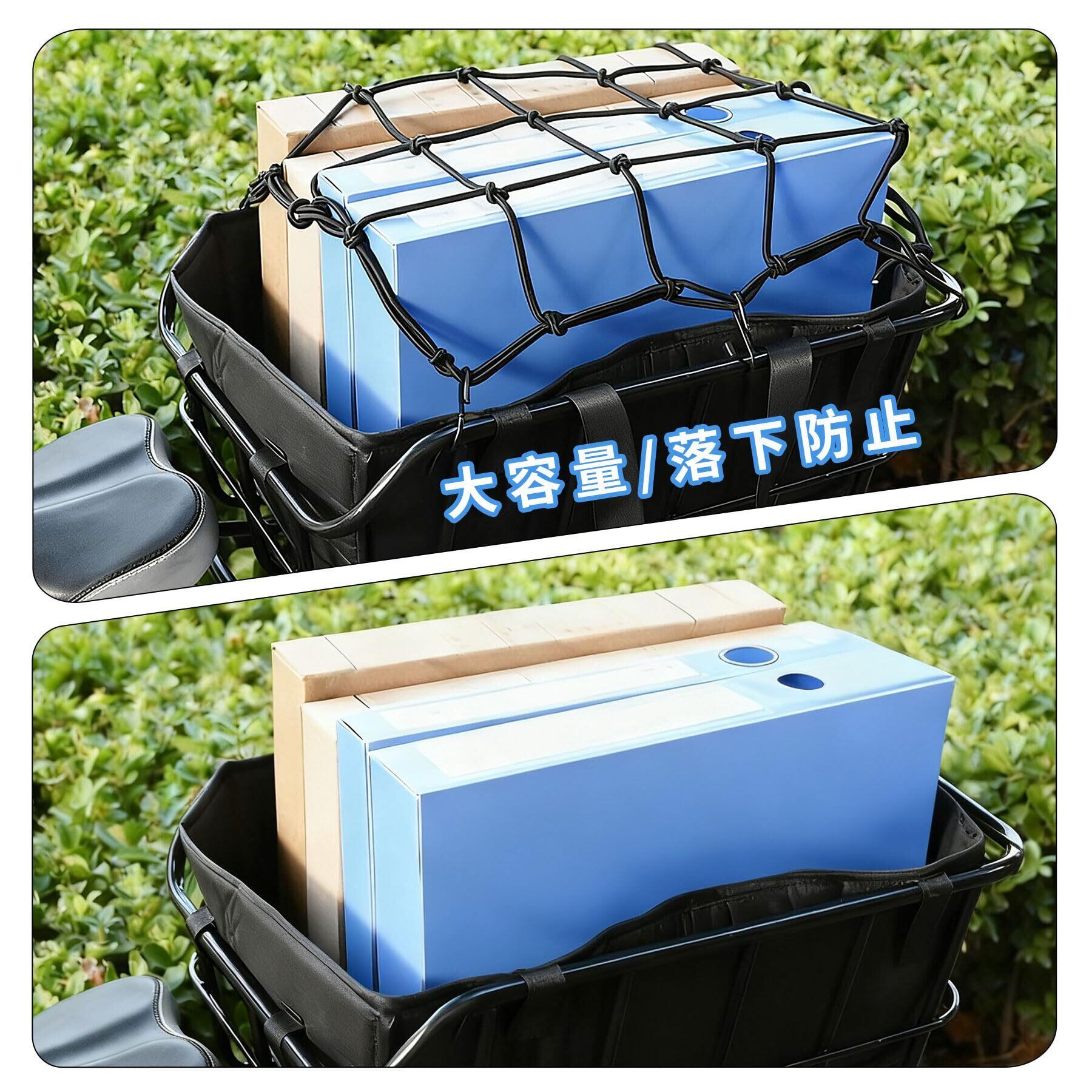 【付属品】防水カバーと収納ネットが付属し、走行中の荷物の落下を防ぎます。