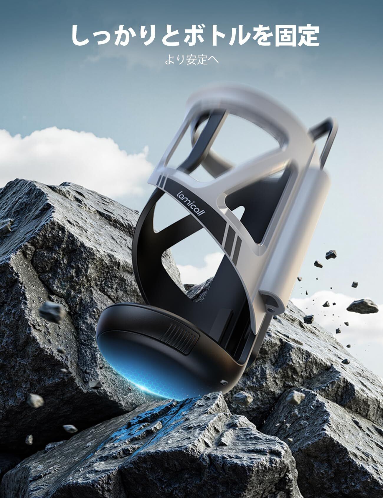 【バネ式・自動調整】ドリンクをしっかりと固定するためにバネ式ホルダーを設計された。ドリンクの太さに合わせて自動調節できて、デコボコな道でもたらす振動でも落下の恐れがある心配もなし。ボトルホルダーの可動範囲は58mm—86mmで、ワイドな調整直径なので、350ml缶や500mlペットボトルなど多種のドリンクに対応できます。(ご注意:自動調節ホルダーはボトルをしっかり固定するため、きつくなってしまい、柄のついたボトルの表面に傷がつくことがあります。)