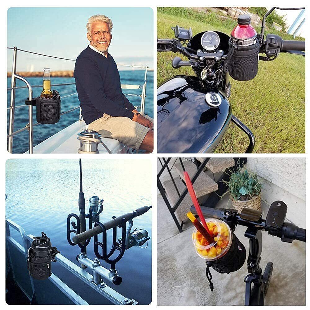 【製品仕様】KEMIMOTO バイク ドリンクホルダーは、高さ13cm・外径約10cmで、引き紐を調節して、350ml-720mlの魔法瓶、サイクルボトル・ペットボトルなどをしっかり入ります。走行中の水分補給に最適!!