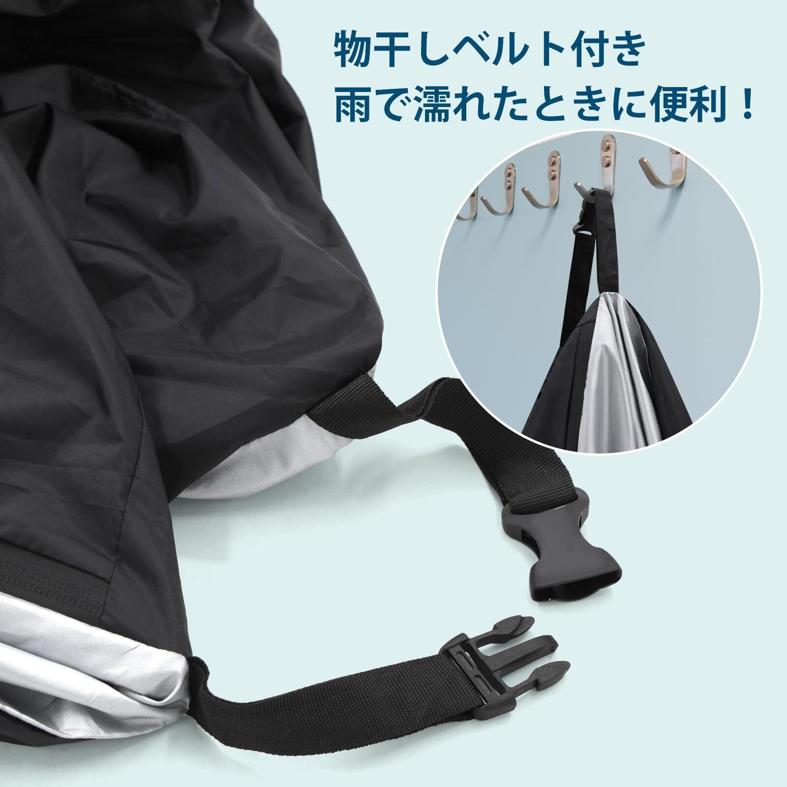 【防風×掛けやすい】下の部分の前中後の3ヶ所に風飛び防止のワンタッチベルト付き、台風・強風でも飛ばされない!裾部分に絞りゴムが搭載されて、立体裁断なので、自転車にピッタリフィットできます。雨で濡れたときに便利になる物干しべルト付き、物干しポールに簡単に干せる。