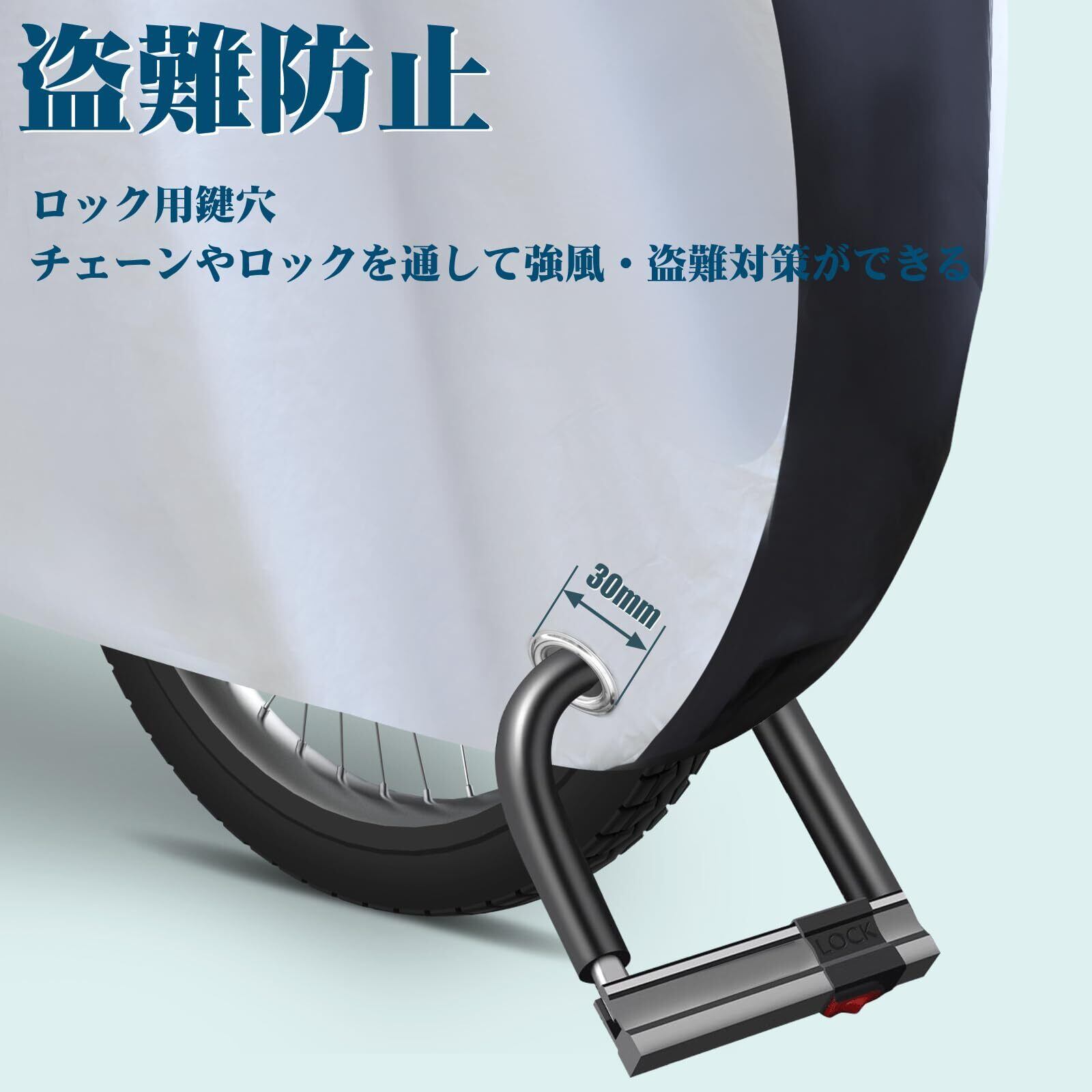 【盗難防止】大口径ロック用ホールを採用して、ほとんどのロックが適用されて盗難対策ができます。【持ち運びも便利】収納袋付き、コンパクトに収納できます。【一年間安心】万が一商品には何か不備がございましたらお気軽にご連絡くださいますようお願い申し上げます。あり・破れにくい】高密度のポリエステル生地を使用し、ビニール製の自転車カバーより5倍以上の強度があり、丈夫で破れにくく、耐久性あり、自転車カバーにちょうどいい厚さ、バイクカバーのように厚すぎず、着脱がしやすいサイクルカバーです。