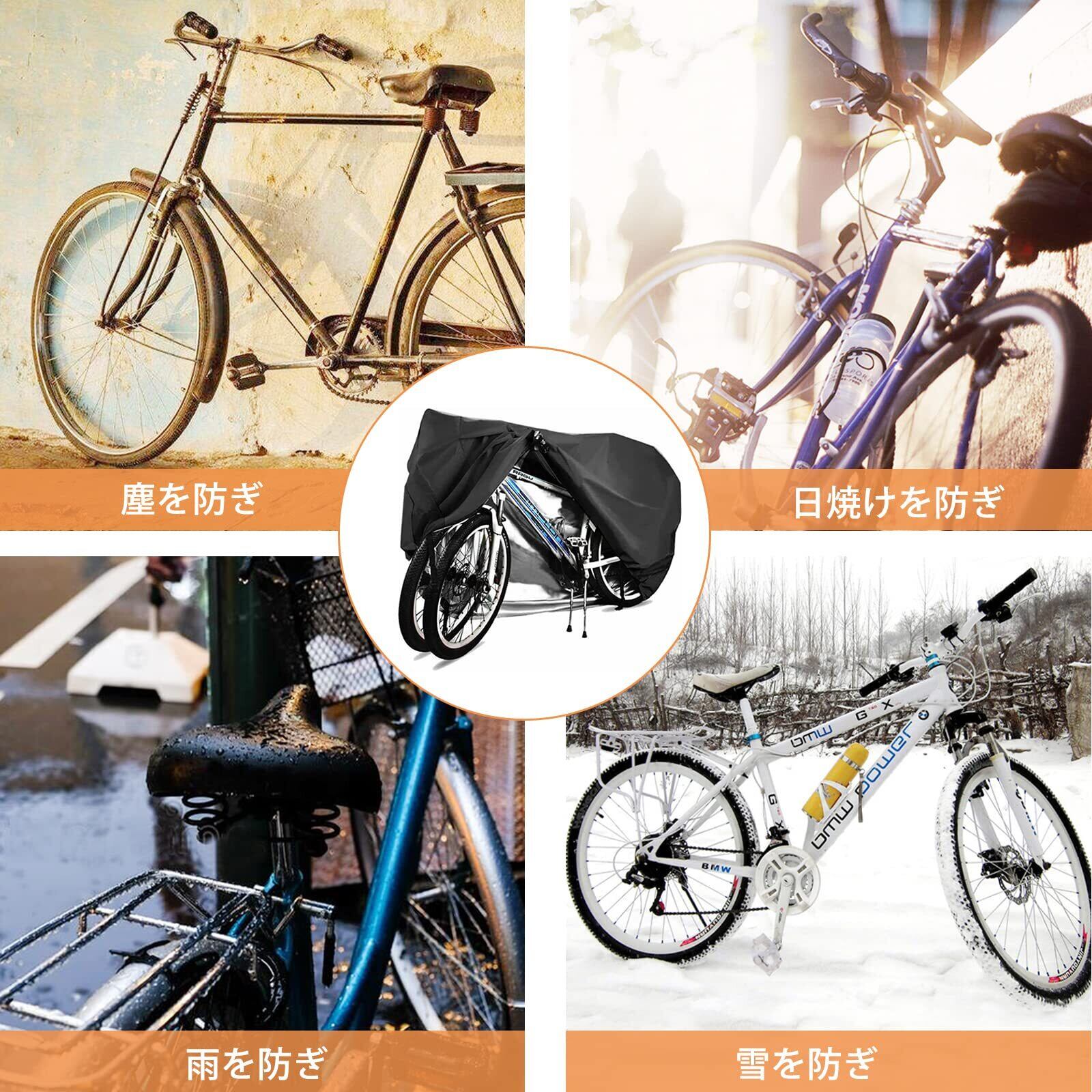 【二台対応、大きいサイズ 】自転車カバーのサイズは約79 x33 x 43inch(200*85*110㎝)、前輪と後輪の裾部分には伸縮ゴムが付いていて、カバーの長さ調整が可能で、子供乗せ自転車や前後幼児座席付自転車に対応でき、サイズ調節にとても便利です。29インチまでの自転車やバイクが二台対応できます。