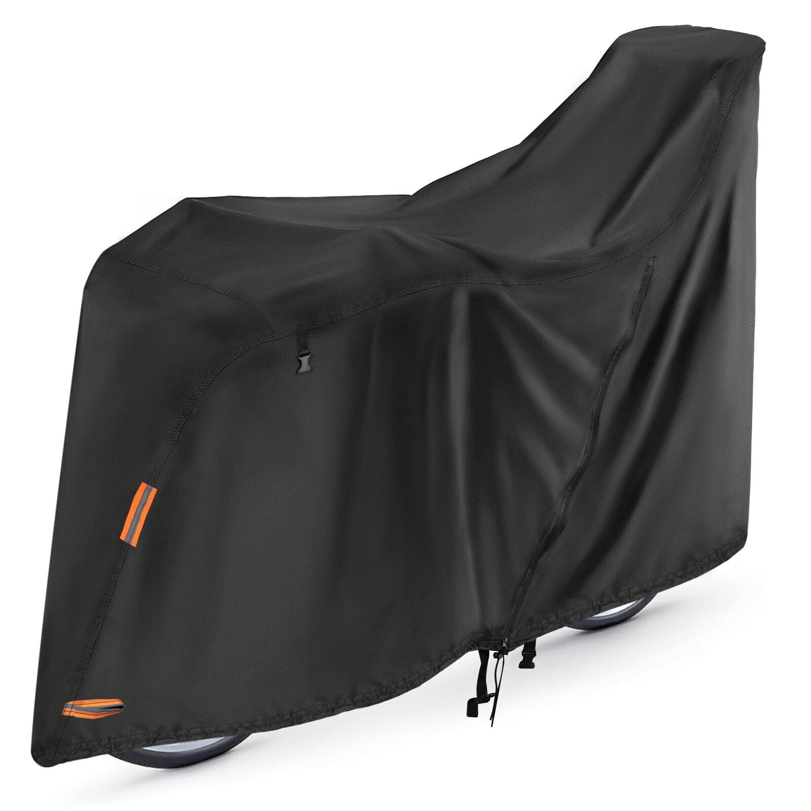 【盗難防止&反射テープ】カバー前輪はロック用の盗難防止穴を採用し;大口径ロック用ホールを採用して、鍵を通せば盗難防止にできます。立体構造の裾部分の絞りゴムで自転車をしっかりカバーします。また耐風バックルが設計して、防風力を補強します。反射テープは、駐車場などから愛車を見つけやすくします。
