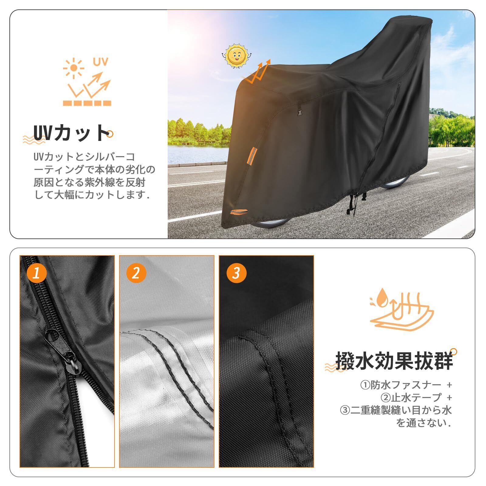 【高撥水・UV加工】材料には丈夫で耐久性のあるポリエステルが使用され、表面にはPUコーティングが施され、防水機能が備わっています。全体的には二重縫製が施され、防水テープが貼られ、ファスナーも防水設計となっており、層を重ねて自転車を保護します。UVカット加工が施されており、紫外線が強い場合でも、愛車を守ることができます。