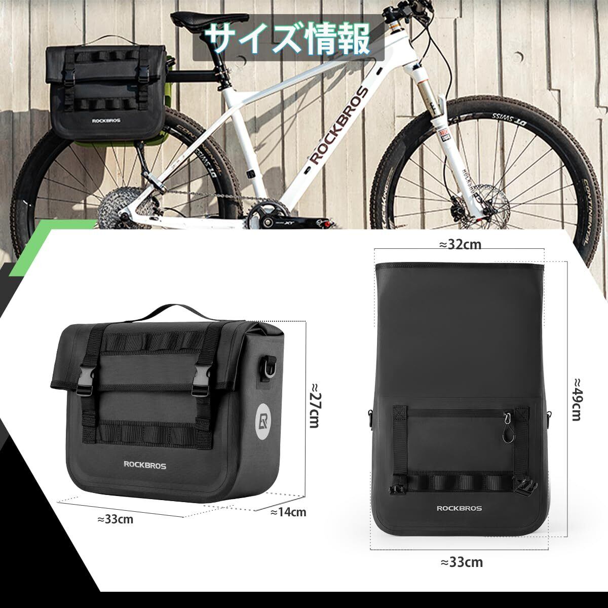 【アフターサービス】1個セット:自転車パニアバッグ*1 付属品(ショルダーベルト*1本、交換用の留め具*2個、ボトムパーティション*1)サイズ:約33cm*27*14cm 材質:600Ⅾポリエステル 色:緑色/ブラック。本体の重さ:1個約1055g 容量:約9L(開ける状態で15L)。ご注意:バッグは平らな状態で届き、使用時には付属のボトムパーティションを手作業でバッグ本体に入れる必要があります。こちらのパニアバッグをご使用中に何か疑問や、誤購入、または万が一不具合がございましたら、ぜひコメントする前に「アカウントにサインイン>注文履歴>この出品者に連絡する]いただけますように、ご連絡いただき次第、速やかに対応させていただきますのでご安心ください。