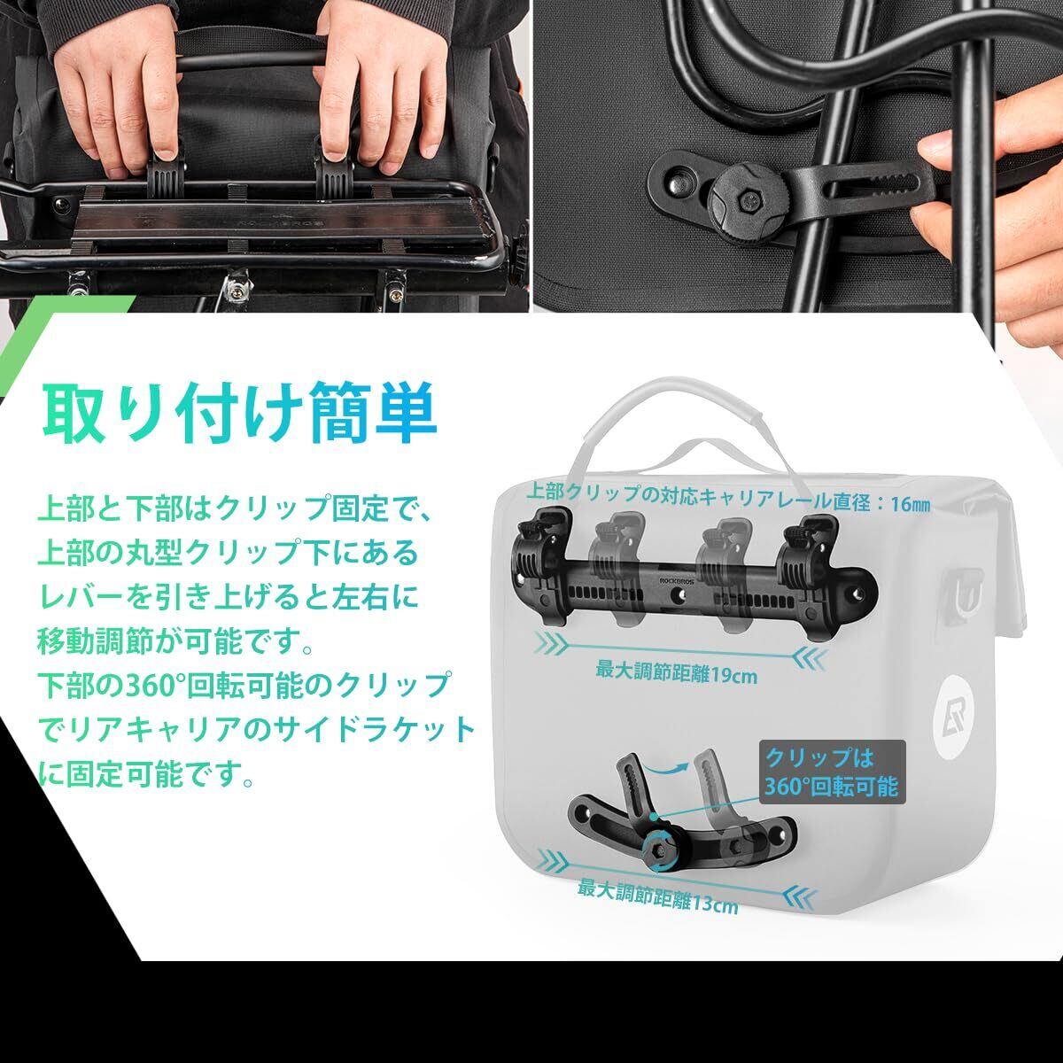 【取り付け簡単】バッグの上部と下部はクリップであり、リアキャリアに固定可能です。(上部の対応リアキャリアの径は約16㎜まで)上下部のクリップの位置が調整でき、様々な車体に対応可能です。自転車から外した際には持ち運びに便利な取っ手も付いて、ショルダーが付くのでショルダーバックとして使います。