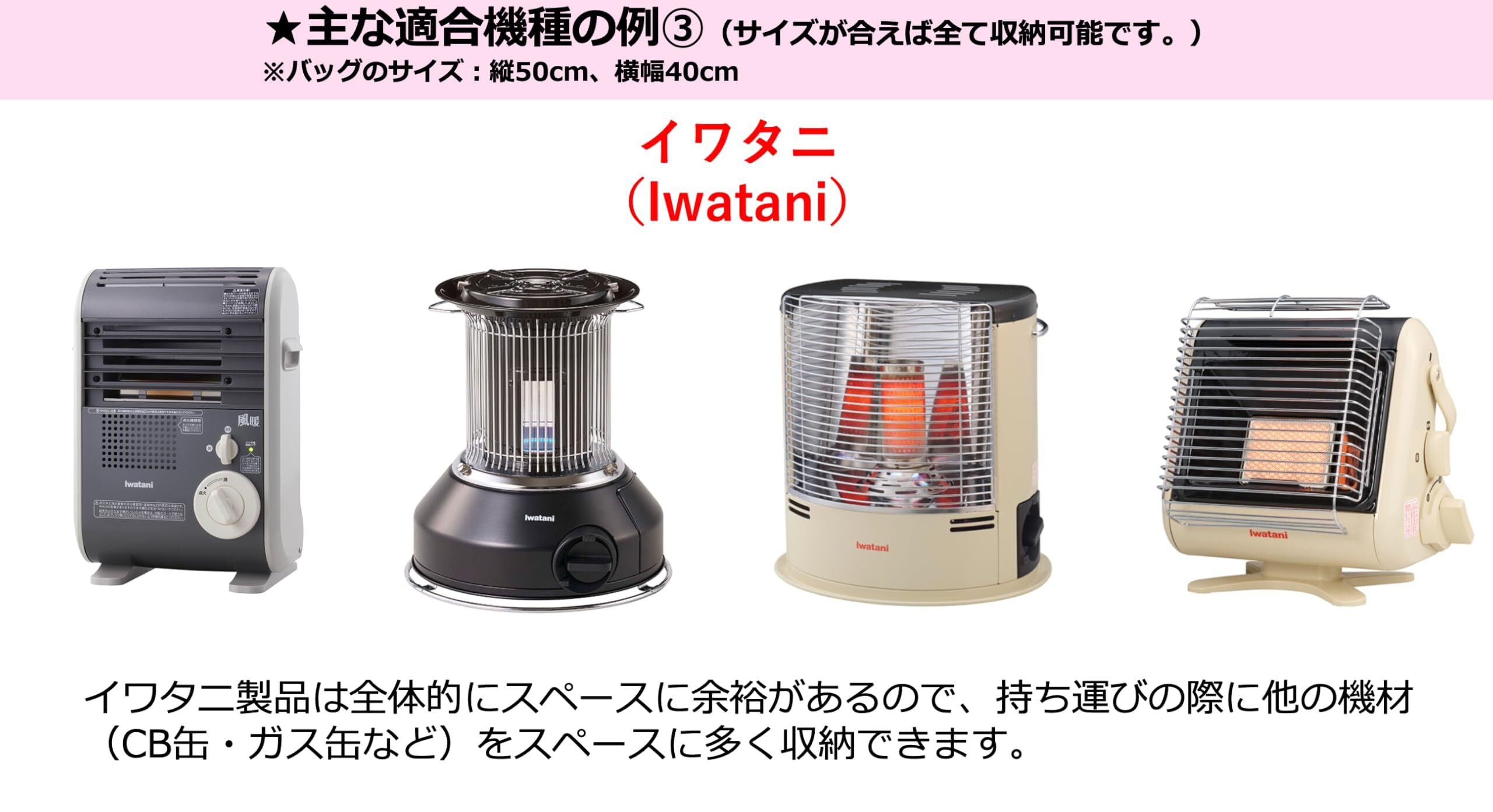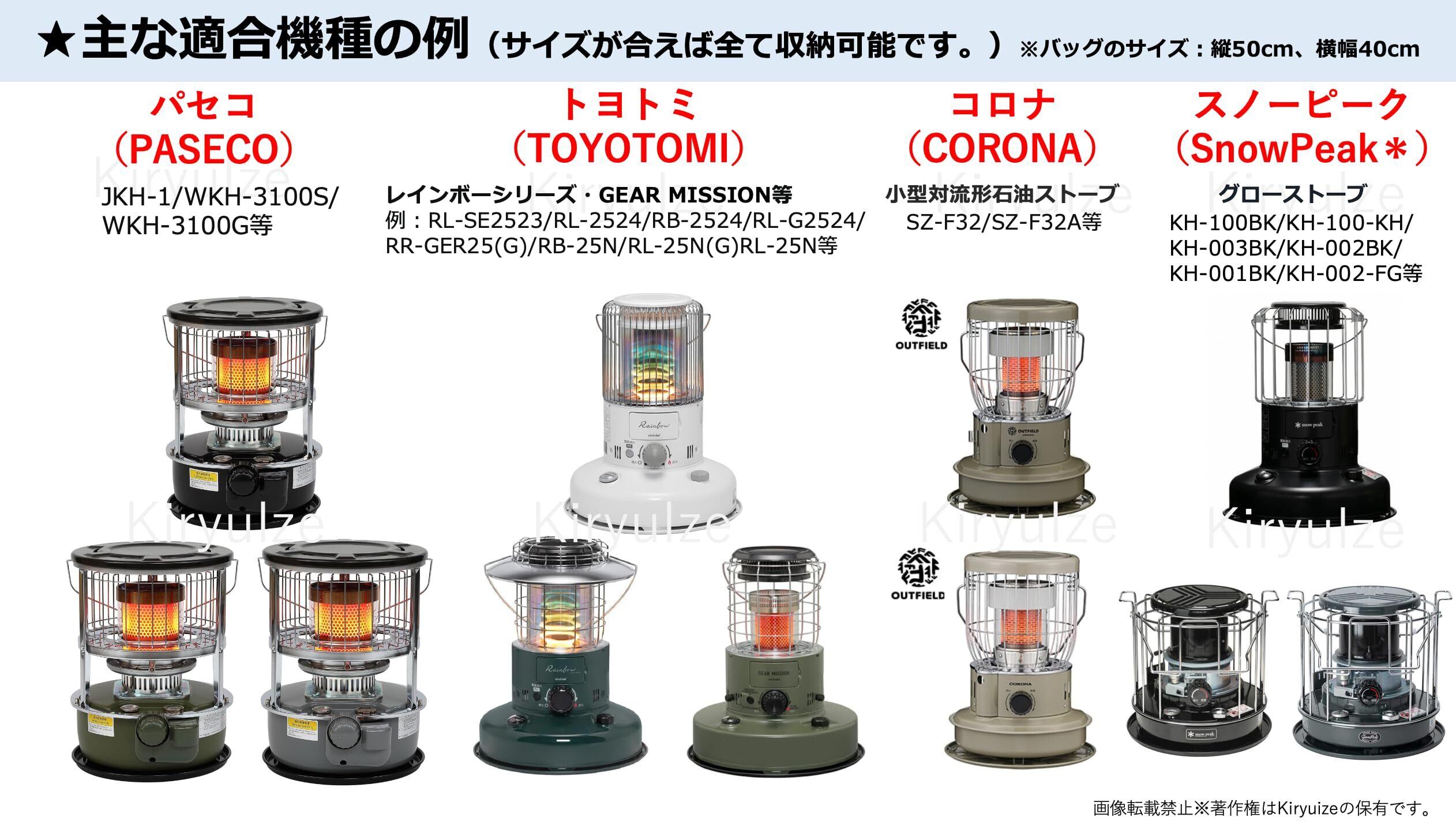 対応機種:トヨトミレインボーストーブ、スノーピークグローストーブ、パセコ、コロナSZ-F32、イワタニマル暖、アラジンAKP-U2801/CAP-U2801等の各種ストーブに対応