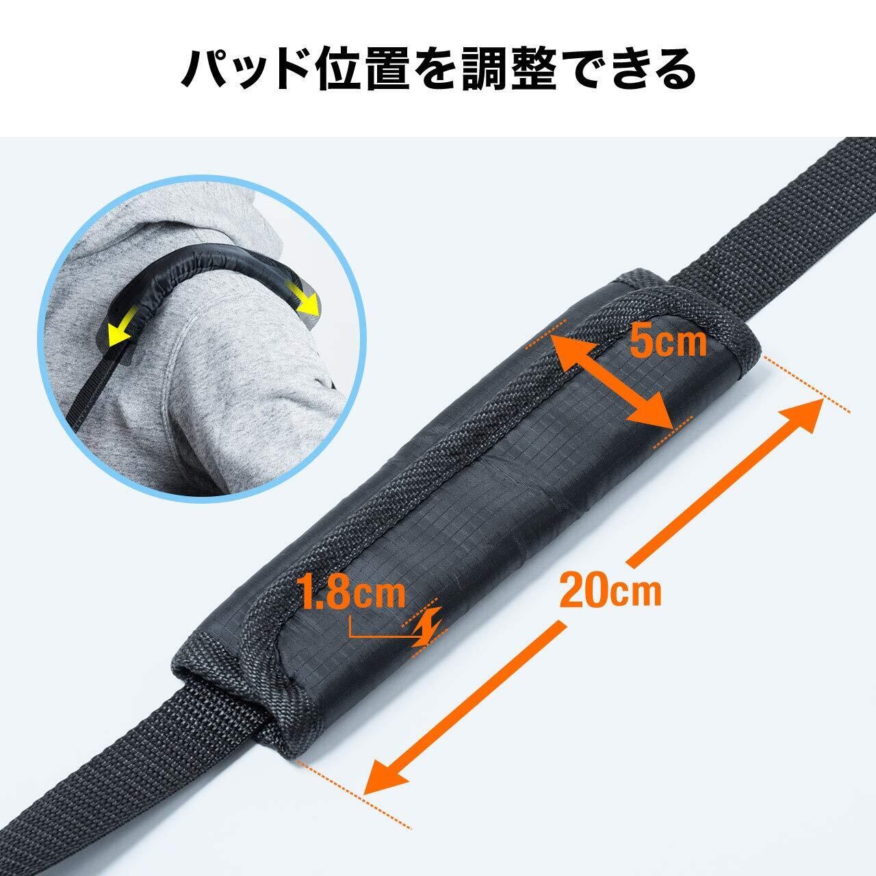 肩掛け紐の肩パットも大きく、持ち下げしやすいデザインです。肩掛け紐の根元部分にはセキュリティワイヤーを通すことができ、盗難防止対策も可能です。輪行時以外は小さく折りたたみ、付属の袋に収納すれば、ベルトでサドル下に取り付けできます。