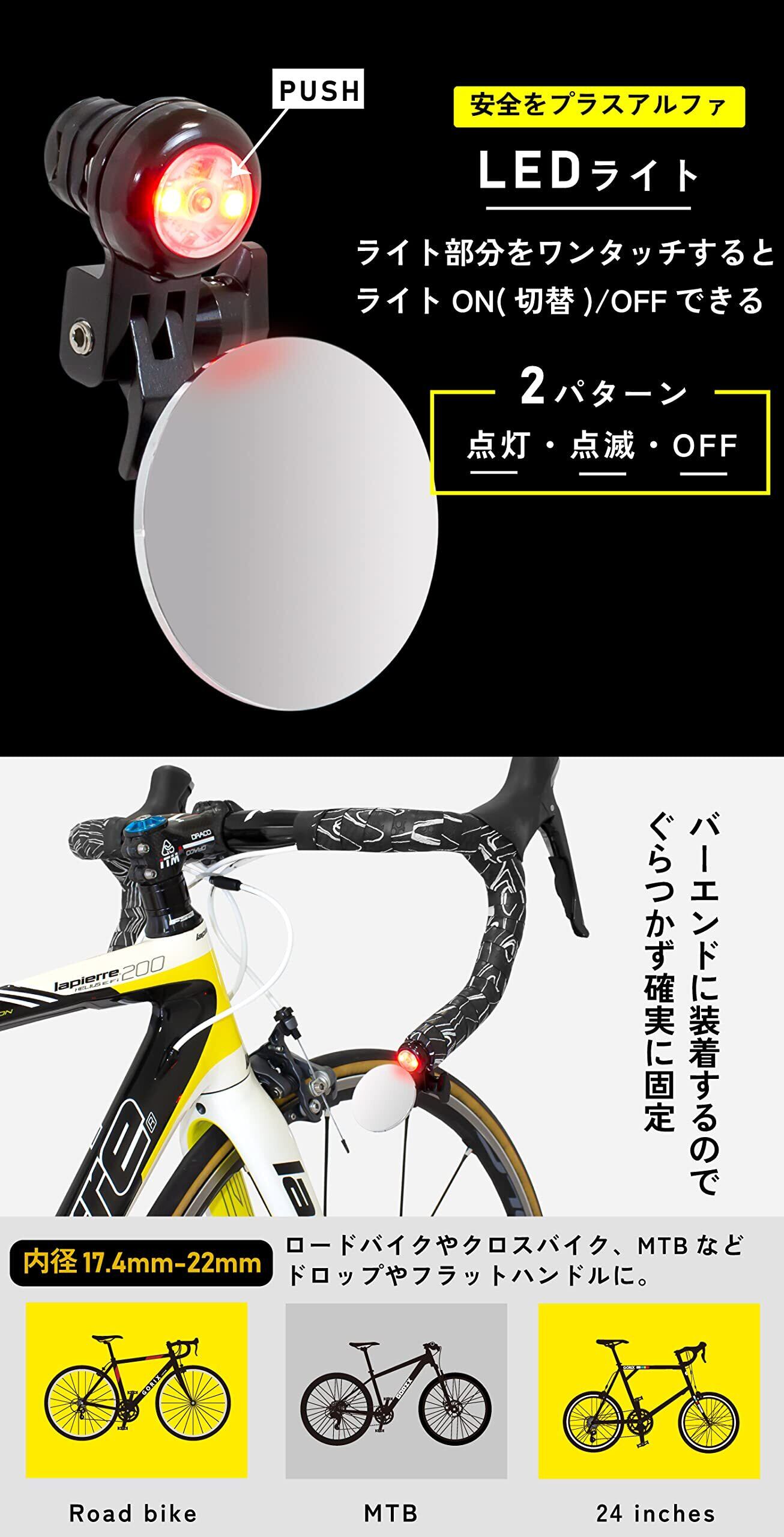 GORIX(ゴリックス) サイクルミラー LEDライト付き バーエンド 自転車ミラー ロードバイク 軽量 バックミラー (GX-CCM9) 可動式調整可能 アルミ セーフティー ミラー 取付簡単 補助ミラー