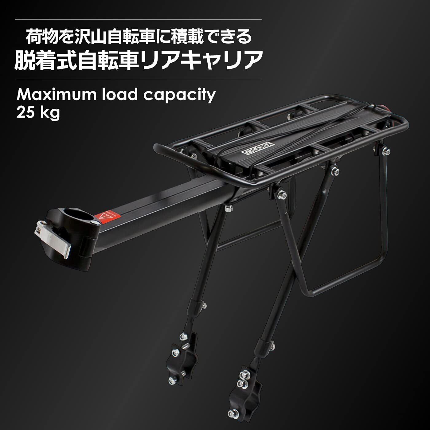 [商品内容]:自転車用リアキャリア・日本語説明書[本体サイズ(約)]:53×14cm[材質]:アルミニウム合金[最大耐荷]:約25kg[組立と取付方法]:説明書内容ご参照ください。