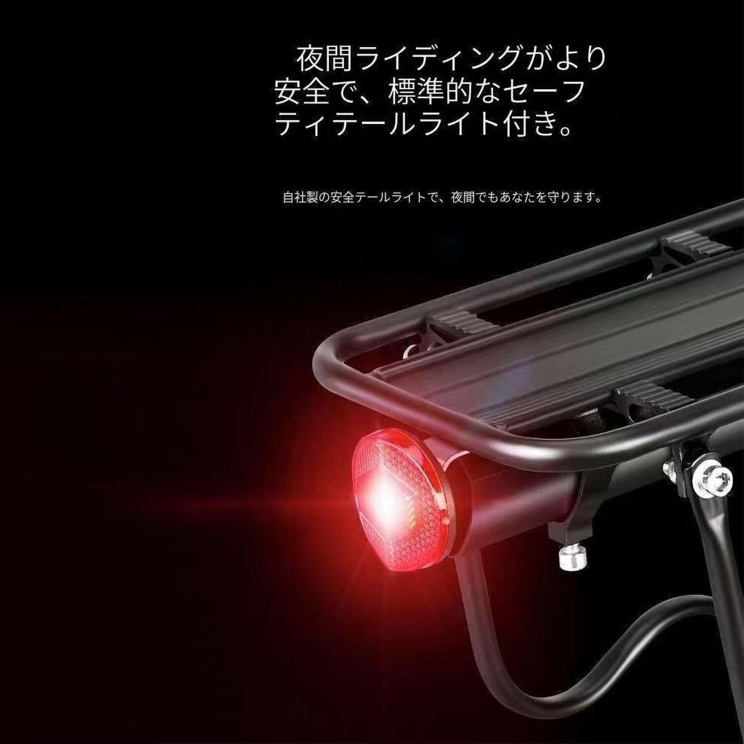【安全性強化リアリフレクター】赤いリアリフレクター付きで夜間走行や暗所での視認性を高め、安全なサイクリングをサポートする自転車キャリア。