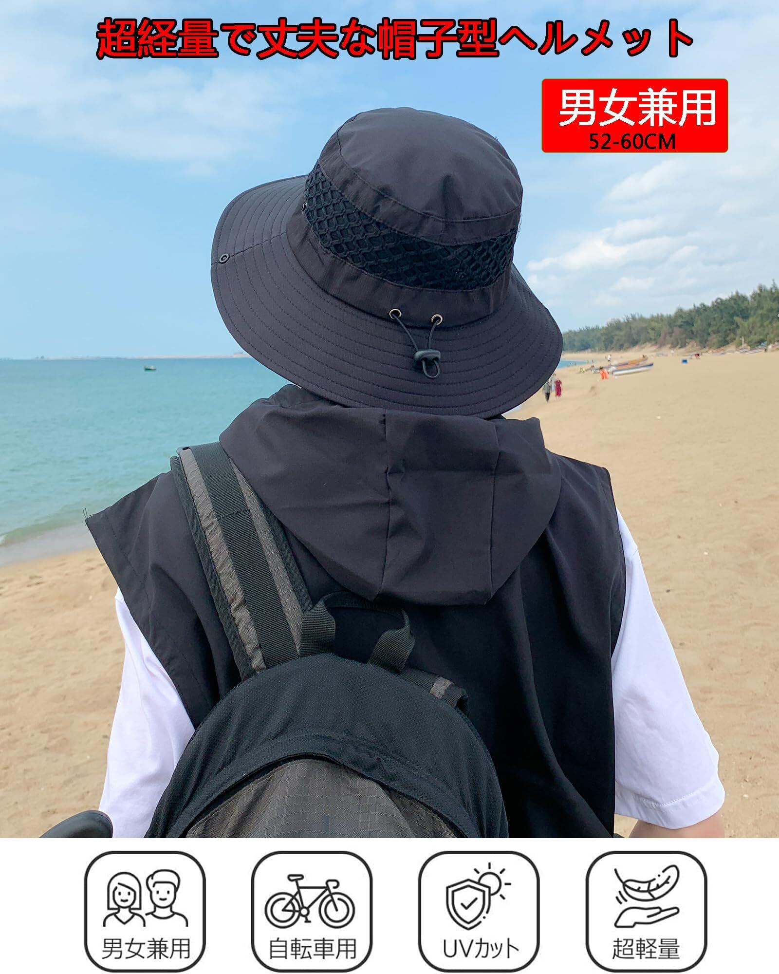 【頭囲・紫外線対策】頭囲約52~60cmに対応、あご紐の調節も可能で、頭にフィットするようにコードの長さを簡単に調整できます。 UVカットキャップ、つばの長いタイプで、日焼けや日差しから顔を守ります。紫外線は肌にダメージを与えるので、外出時には日よけ帽子型ヘルメットが不可欠な単品、夏、春の強い紫外線に最適で。