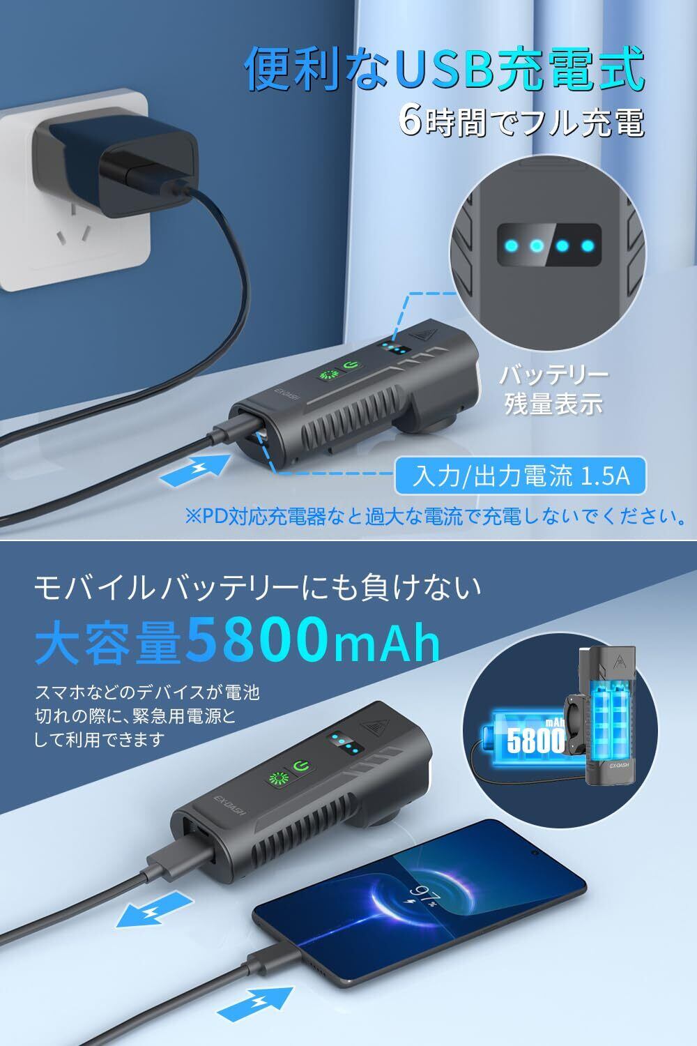 【5800mAh大容量&LED残量表示】内蔵の5800mAhバッテリーは、最大12時間の中輝度点灯や40時間のフラッシュ点灯を可能にします。長時間の使用にも耐え、LED残量表示機能があり、バッテリー残量を容易に確認できるため、常に使用可能な状態を維持できます。これにより、長距離走行や夜間のアウトドア活動においても安心して使用できます。