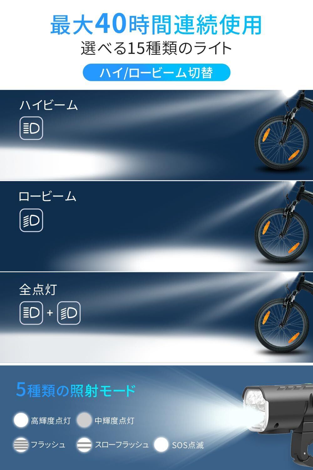 【1400ルーメン&15種類のライト】この自転車用ライトは、1400ルーメンの強力な光を放ち、広範囲にわたる照射を可能にし、暗闇でも道路や路面の状況を明確に把握できます。LEDビーズが4つ搭載され、ハイビーム、ロービーム、全点灯の切り替えができます。高輝度、中輝度、フラッシュ、スローフラッシュ、SOS点滅の5つの照射モードを含む、合計15種類のライトモードを提供します。様々な照明状況に対応し、自転車走行中の安全性を向上させます。