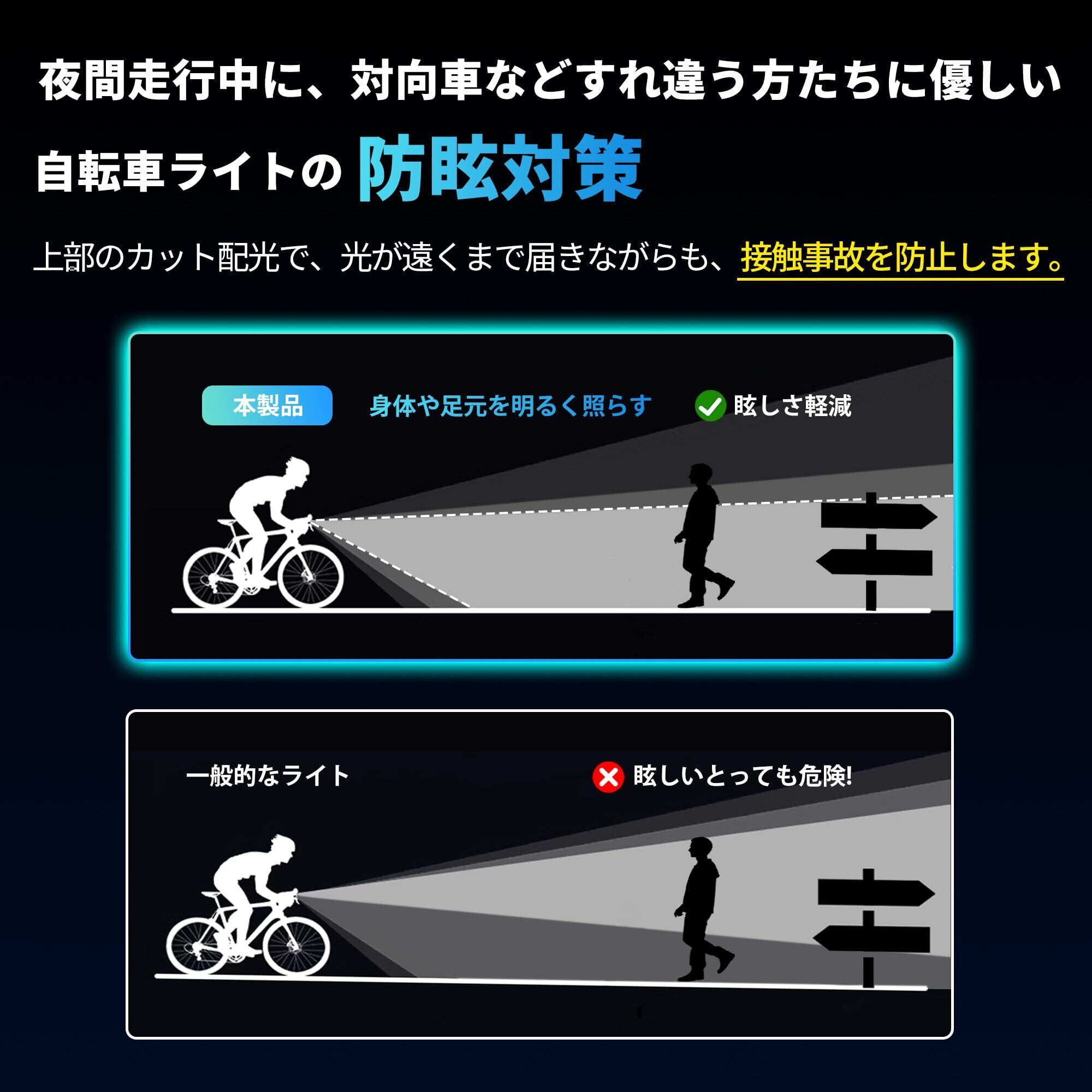 【3つの点灯モード&スマホを充電可能】 ●ハイ・ロー・フラッシュ3つの点灯モードを備え、スイッチを1押しで、ライトモードの切り替えができます。 ●車のライトと同様の約60回/分の点滅モードは、街灯の少ない夜道でも高い視認性を提供して安心です。 ●十分な明るさで道幅いっぱいに照らす。 ●チャージアウト機能も搭載されています。大ピンチの時にはライトを点灯しながら、スマホを充電できます。