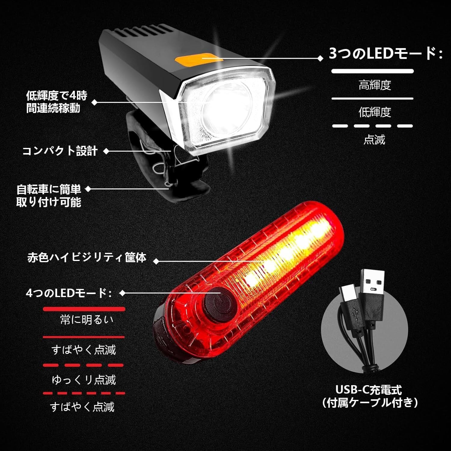 【サイズ】■ヘッドライト:7.2×2.9×2.2cm ・テールライト:7×1.6×2cm ■カラー:ブラック ■パッケージ内容:自転車ライト×1、テールライト×1、充電ケーブル×2、取扱説明書×1。