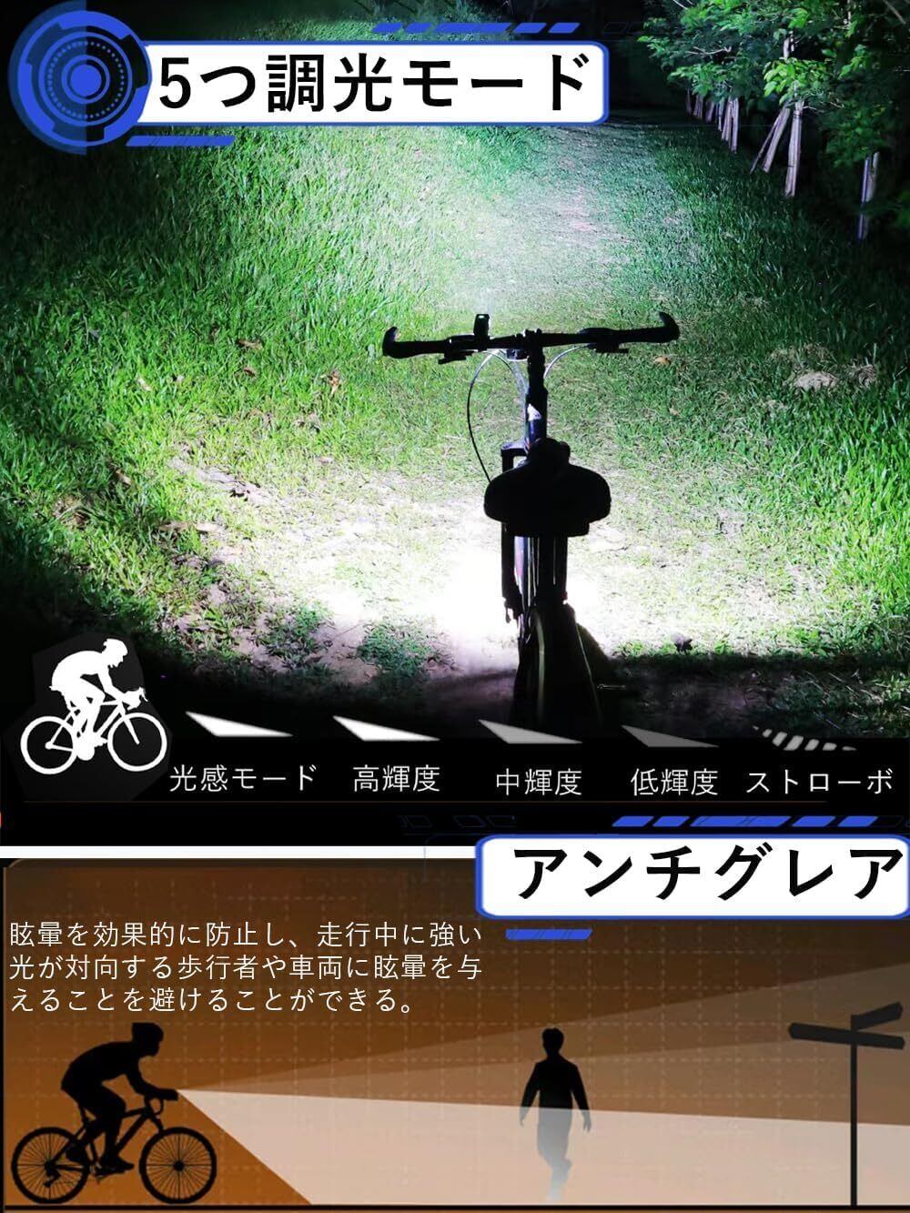 【5つの調光モード+クイッククローズ】 スイッチを軽く押すとセンサーモード-高輝度-中輝度-低輝度-フラッシュ-5種類の照明モードを簡単に切り替え。自転車のライトを使って通勤、通学できるだけではありません,また、登山、夜釣り、夜行、停電、緊急時の懐中電灯の代替品としても使用できます。いずれのモードでも15秒以上点灯し続け、ボタンを1回押すと素早く照明を消すことができる。