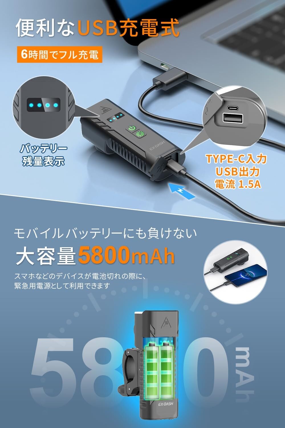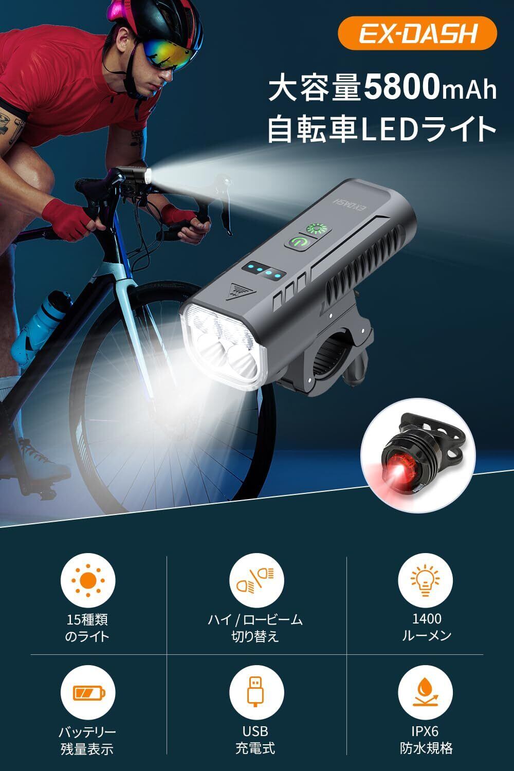 自転車 ライト Type-C充電式 5800mAh大容量 自転車用ライト 4個強力ランプ 高輝度 1400LM 5つ点灯モード 防振 ロードバイク/クロスバイク SOS点滅機能 最大12時間連続点灯 防水IPX6 LED残量表示 テールライト付 取り付け簡単 アウトドア/通勤/通学/夜間走行 (dark)