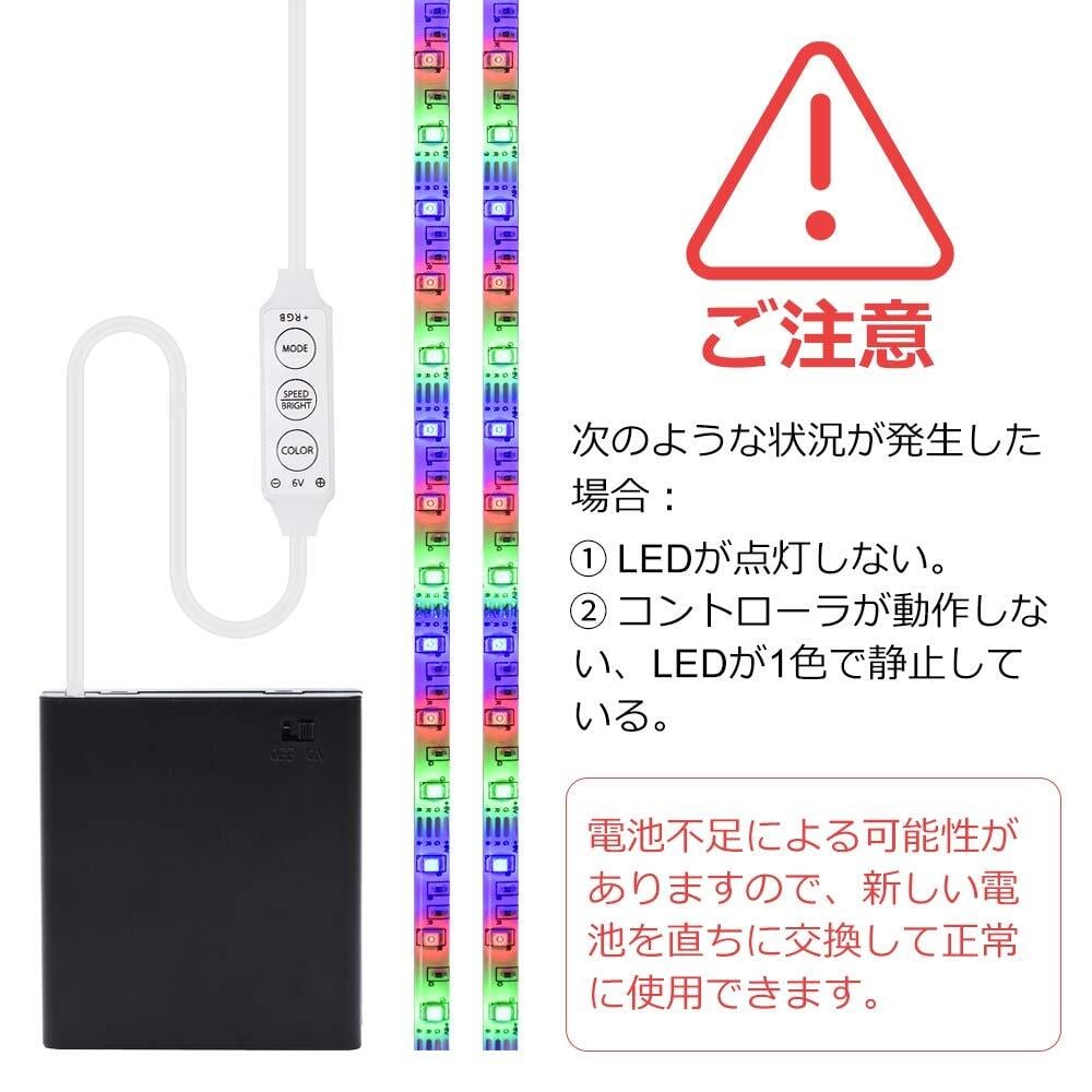 2.【電池ボックスで給電】LEDテープライトは4本の単三形電池(電池を含まない)から供給され、航続時間は長い。また、電池ボックスにはON/OFFスイッチが付いていますので、操作が便利です。 注意:使用時に「①LEDが点灯しない②コントローラが動作しない、LEDが1色で静止している」という現象が発見された場合は、電池不足による可能性がありますので、新しい電池を直ちに交換して正常に使用できます。