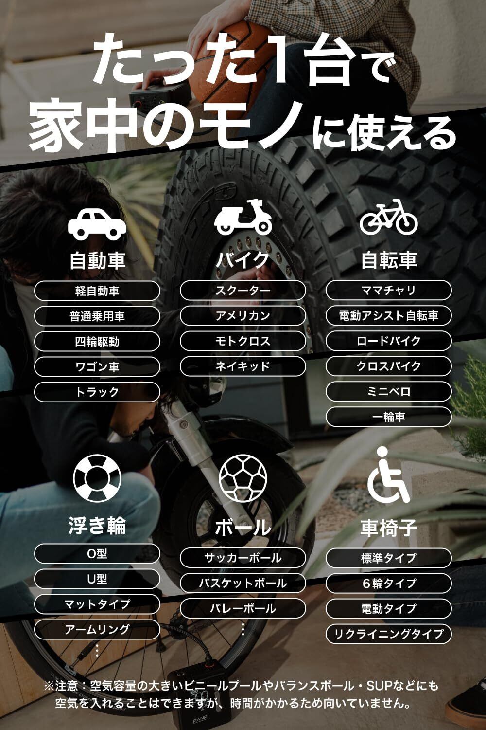 PANP RIDE 空気入れ 自転車 車 バイク ボール 電動 【安さより品質で選ぶ人へ】 米式 英式 仏式 すべてのタイヤ対応 日本 メーカー2年