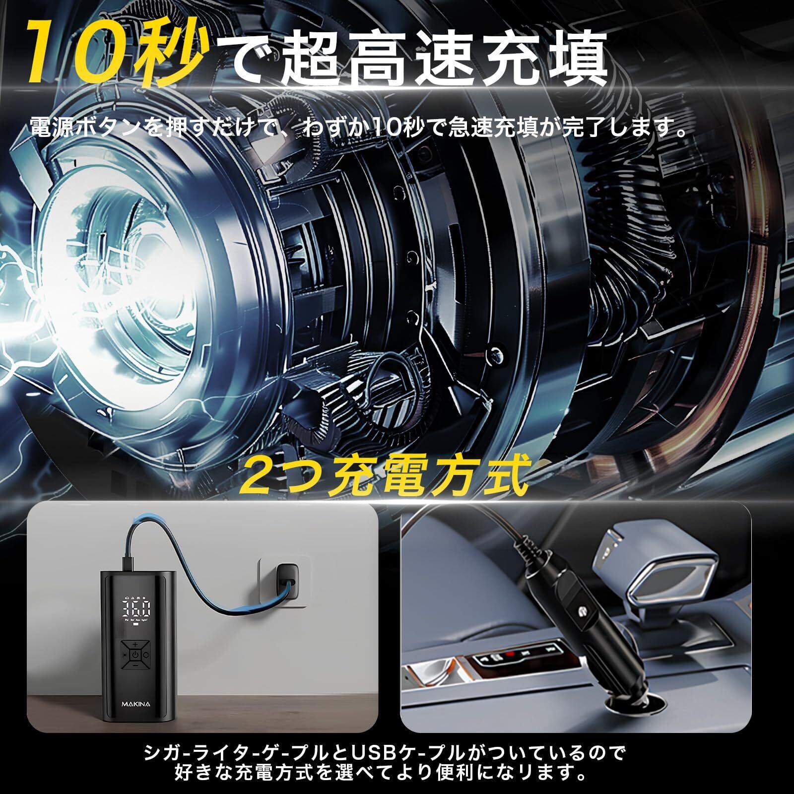 【大容量6000mAh & 急速充填で外出先も安心】 1回のフル充電で自転車24回分・自動車12回分の空気充填が可能。USB/シガーソケットの2WAY充電に対応し、車内や屋外での緊急時も即稼働。ブラシレスモーター搭載で60秒でバイクタイヤの0→35PSI充填完了。