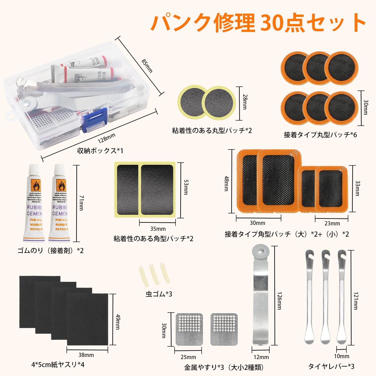【自転車パッチセット30点】あらゆるパンクシーンに強く対応!軽量・コンパクトで持ち運び至便な自転車用緊急パンク修理キット。パンク修理キットには、修理に必要な道具が充実しています。14 枚の 2 種類のパッチ、3 本の金属製タイヤレバー、2 本のゴムのり、3 枚の金属やすり(2 種類のサイズ)、4×5cm の紙ヤスリ、3 個の虫ゴムが含まれています。通勤や通学の際、バックパックに入れておけば、自転車に乗るときも安心感が倍増します。