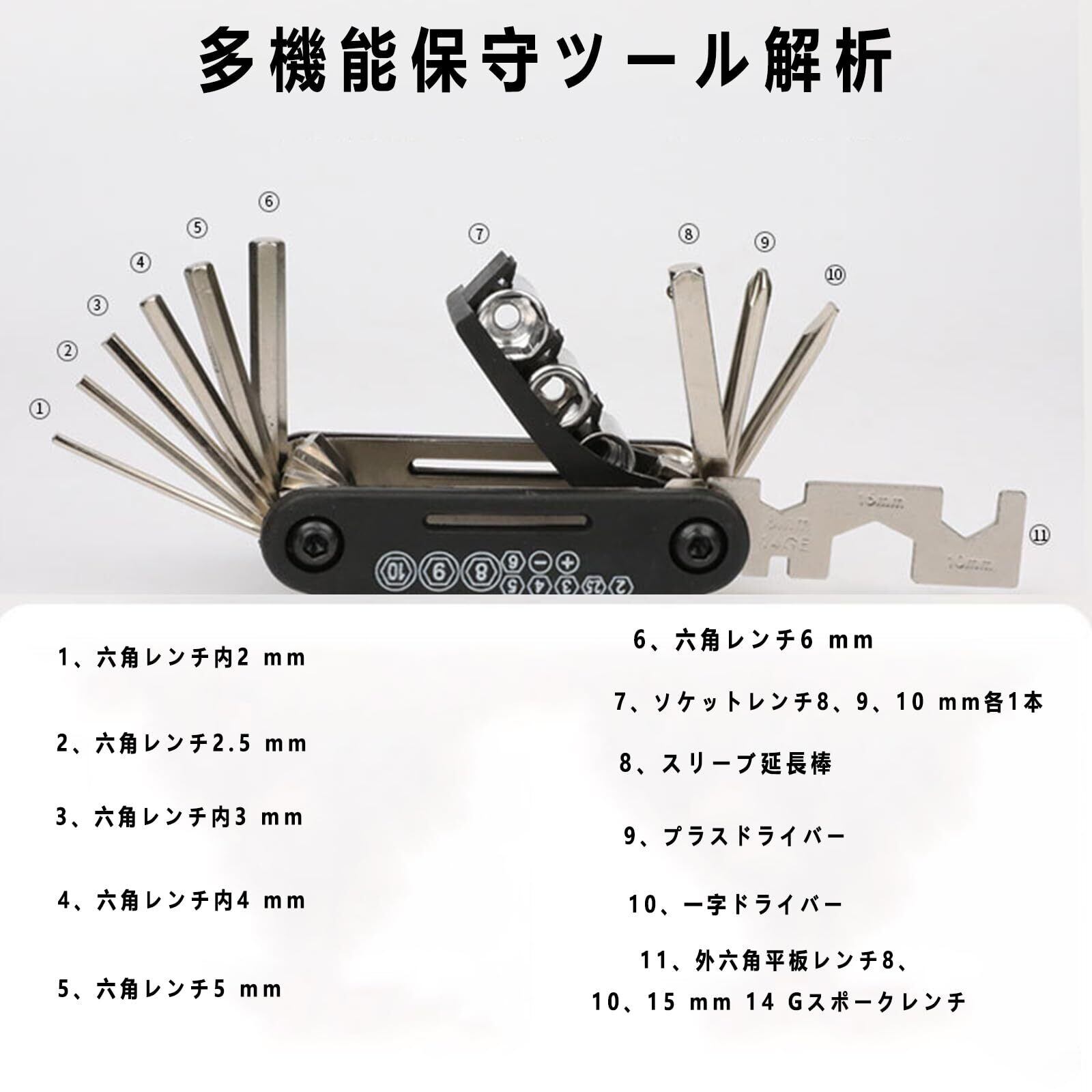 【製品の内容16in1多機能】14GE/8/10/15mm六角ボルトレンチ、2/2.5/3/4/5/6mm六角棒レンチ、8/9/10mmソケットレンチ、プラス(+)ドライバー、マイナス(-)ドライバー、ソケット取り付けバー。
