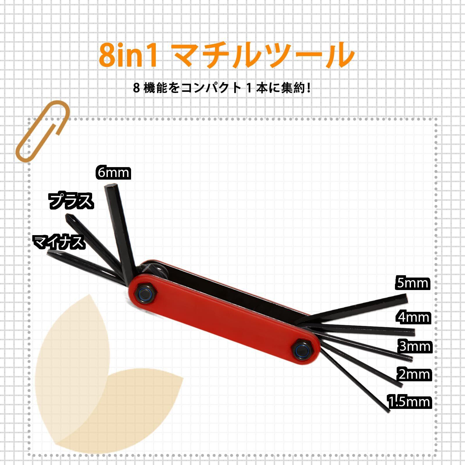 【8機能オールインワンツール】日常整備から急な修理までこれ1本!6サイズの六角レンチ(1.5/2/3/4/5/6mm) とプラス/マイナスドライバーをコンパクト1本に集約。ロードバイクやマウンテンバイクの基本的な整備・調整はもちろん、日用品のちょっとした修理にも幅広く対応します。