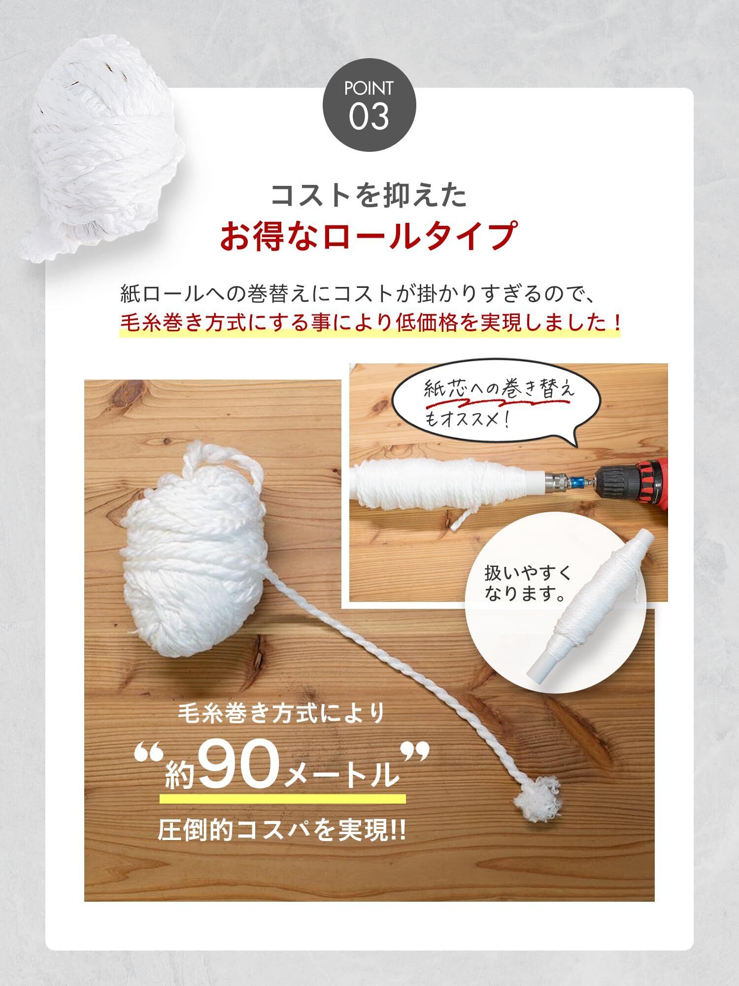 【毛糸のようなロールタイプ】紙ロールに巻くと価格が跳ね上がってしまうのでコスト重視で毛糸の様に丸めました。意図せずほぐれて絡まることが難点ですが、切って使うかラップの芯などに巻き直すのもおススメです。