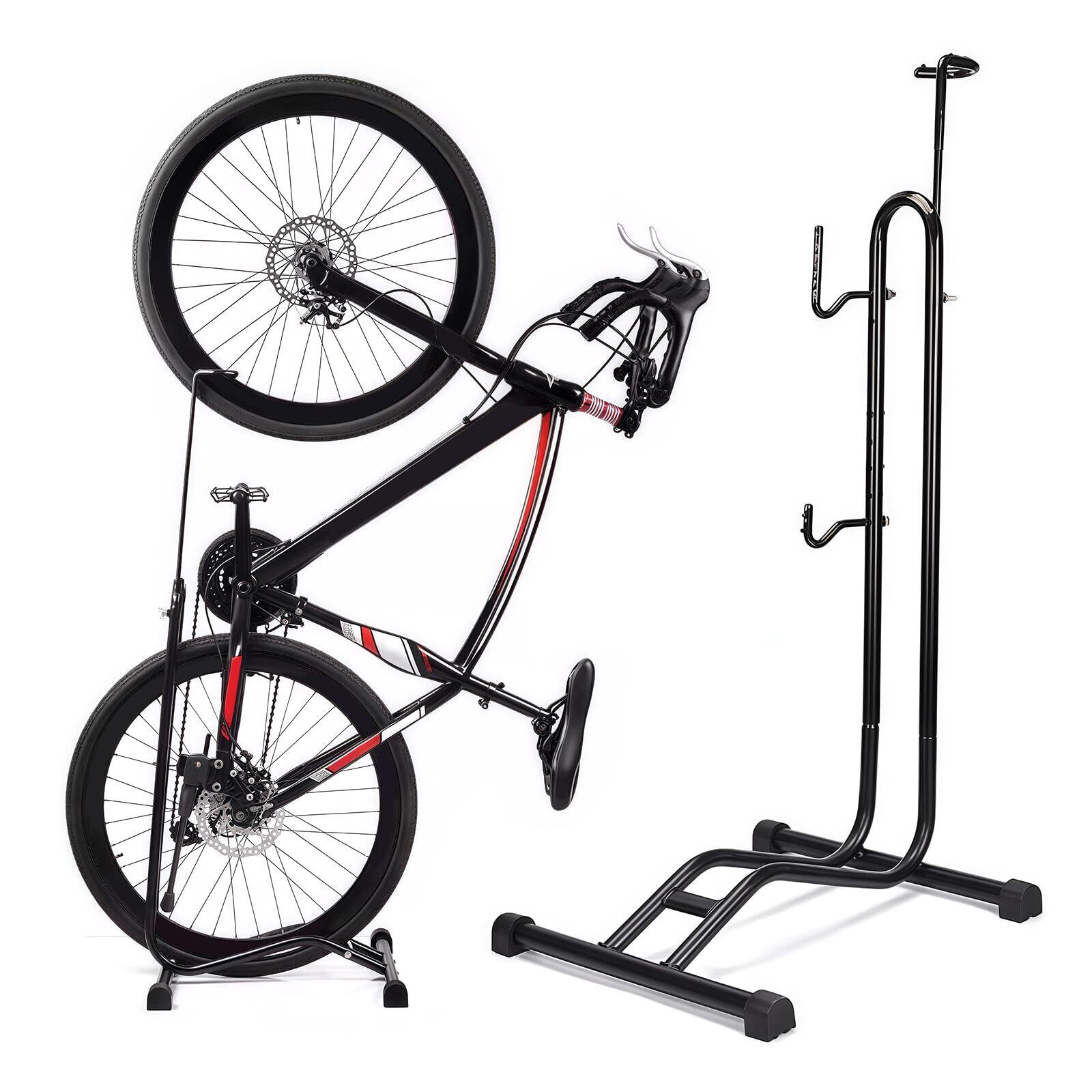 【3タイプの置き方】自転車スタンドを利用すれば、自転車は縦置き、横置き、掛け置き、3通りの方法で置くことができます!縦置きならスペースを有効活用でき、横置きではフロントホイールを差し込むだけで、自転車がしっかりと安定します。さらに、U字フックにチェーンステーを引っ掛ければ、後輪を浮かせてメンテナンススタンドとしても利用可能です。